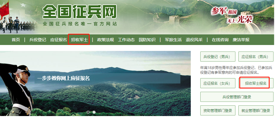 招收军士采取网上报名,普通高等学校男性应届毕业生可登录“全国征兵网”查询招收专业,符合专业条件的,在进行大学生网上预征报名的同时申请参加招收军士报名。