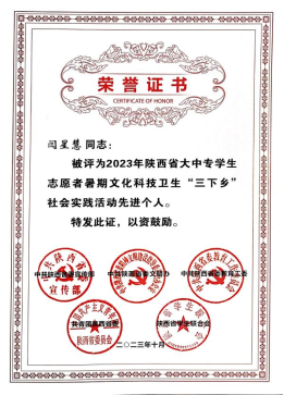 10.2023年11月,荣获陕西省三下乡先进个人荣誉称号;
