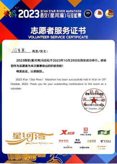 13.2023年10月,荣获西安马拉松志愿者服务证书;