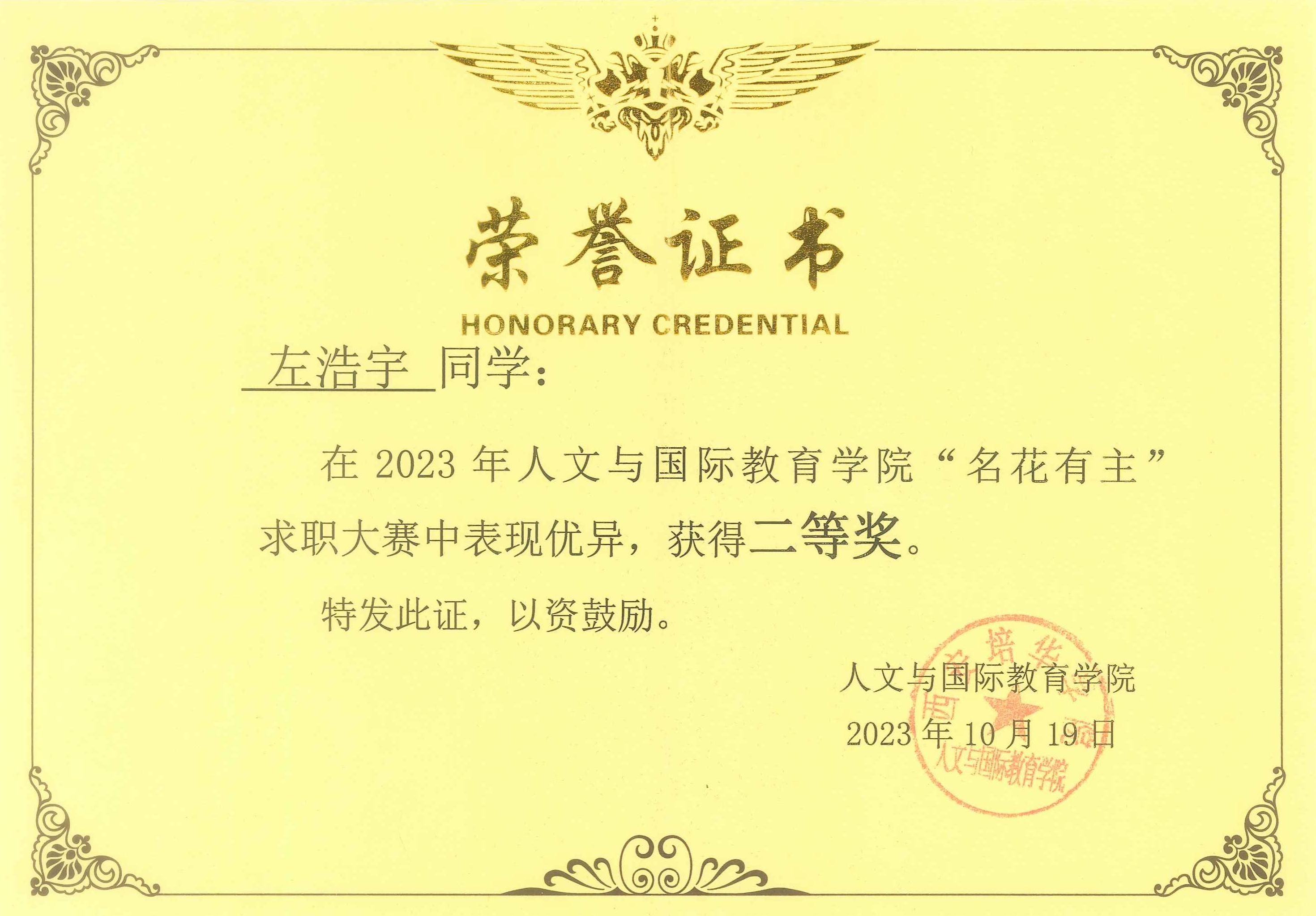 9.2023年获得第十五届“名花有主”求职大赛校级总决赛三等奖;