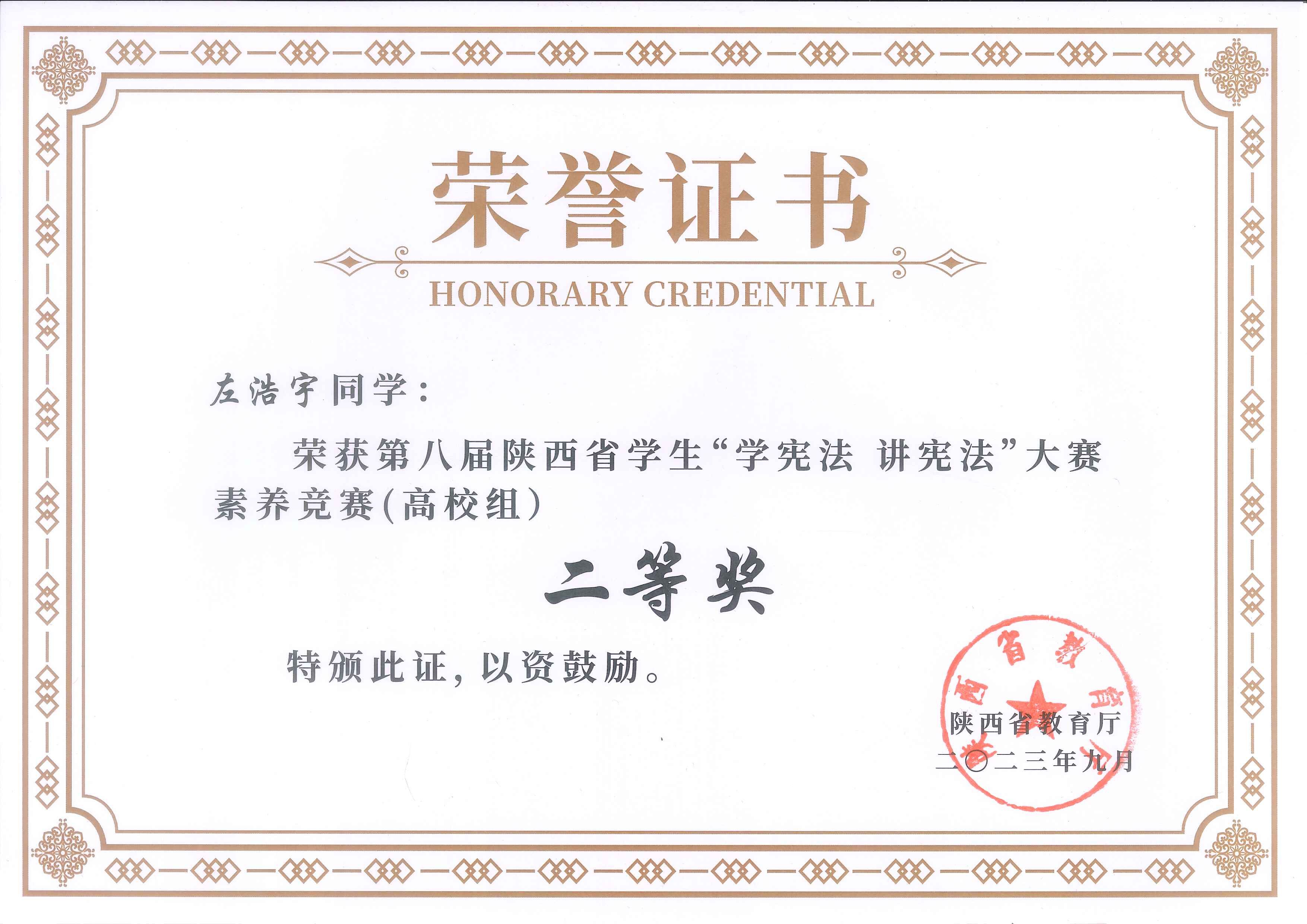 10.2023年获得第八届陕西省学生“学宪法 讲宪法”大赛暨国赛选拔赛高校组二等奖;