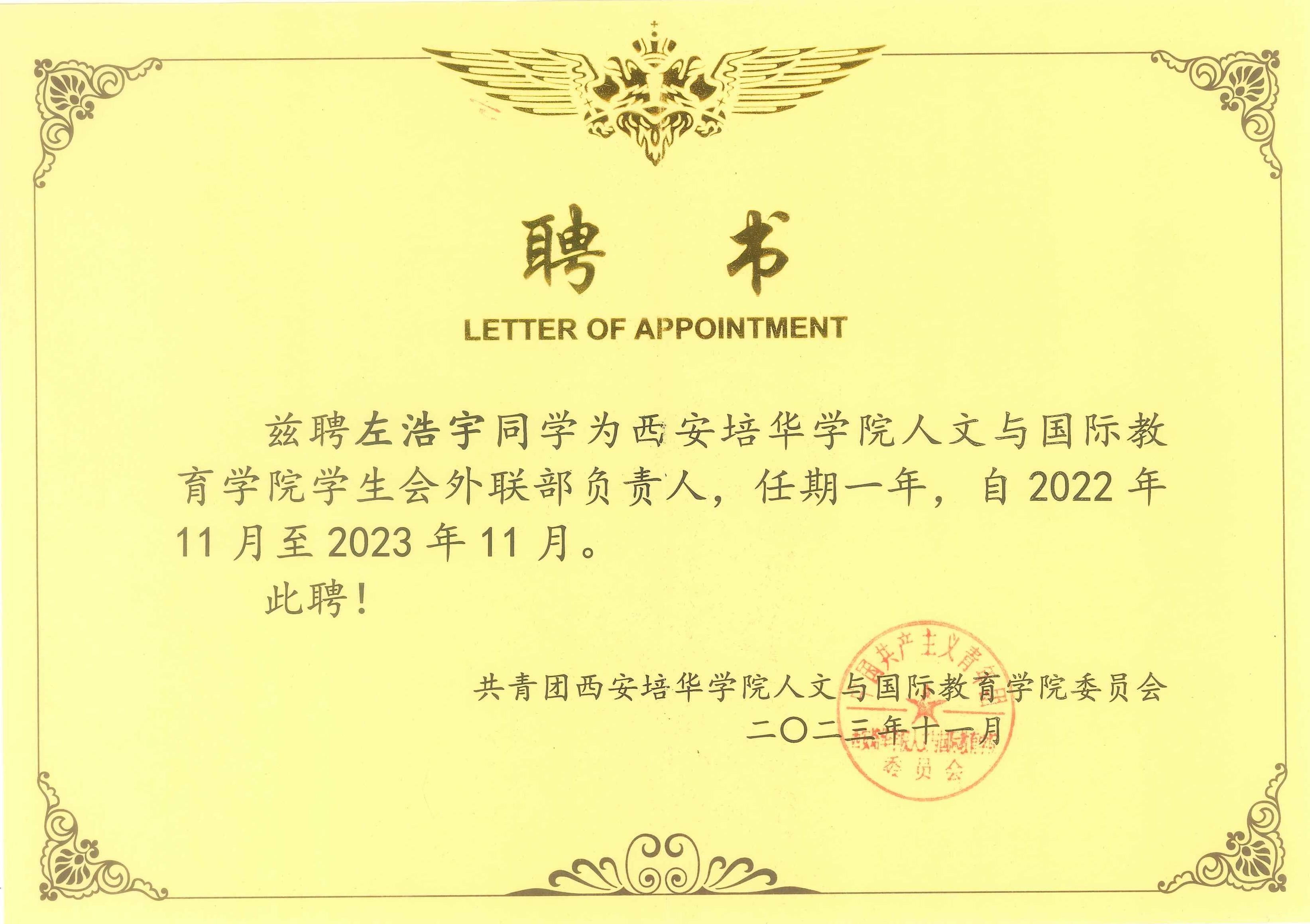 左浩宇担任法学2101班班长、团支部副书记、法学院党总支学生工作部部长、法学院学生第一党支部组织委员,曾担任人文与国际教育学院学生会外联部负责人、人文与国际教育学院学生第三党支部助理。在担任班长期间,左浩宇同学积极为同学们解决问题,为老师分忧,积极协调班级总体事务,以身作则,带领同学们争优创先,所在班级荣获“姜维之班”优秀创建班级、西安培华学院先进班集体、五四红旗团支部等荣誉称号。在处理党务工作中,他认真负责,恪尽职守,高质量完成各项工作,被评为“优秀学生助理”“党务工作标兵”等。在学生会工作期间,他努力做好本职工作,发挥好身为学生干部的作用,牢记学生会工作人员的准则,被评为“优秀学生干部”。在校园工作中,他积极热情,锐意进取,虚心向别人学习,随时进行批评与自我批评,做到有错就改,始终以“服务同学,锻炼自己”为宗旨,真正做到为同学服务,为校园建设添砖加瓦。