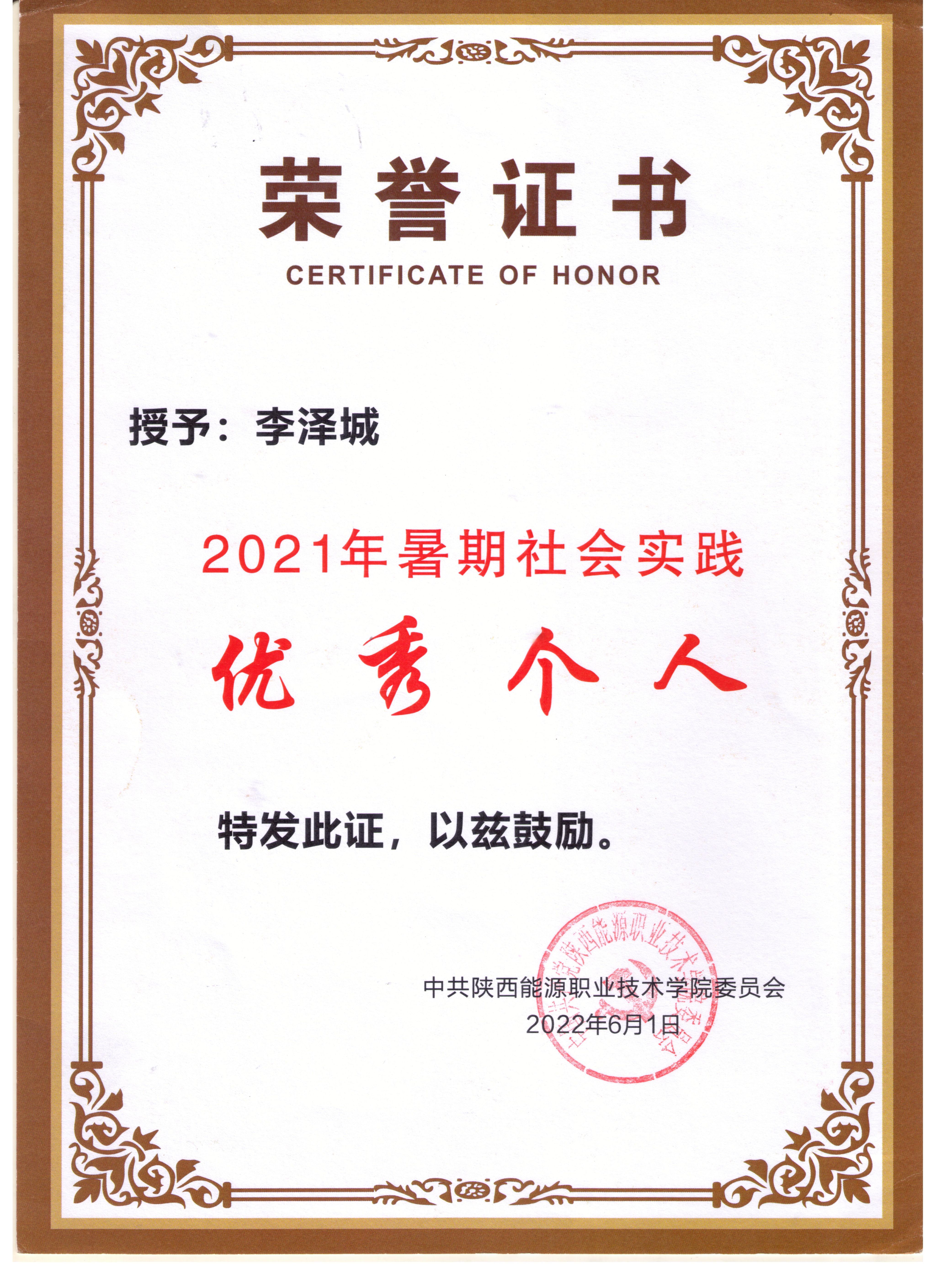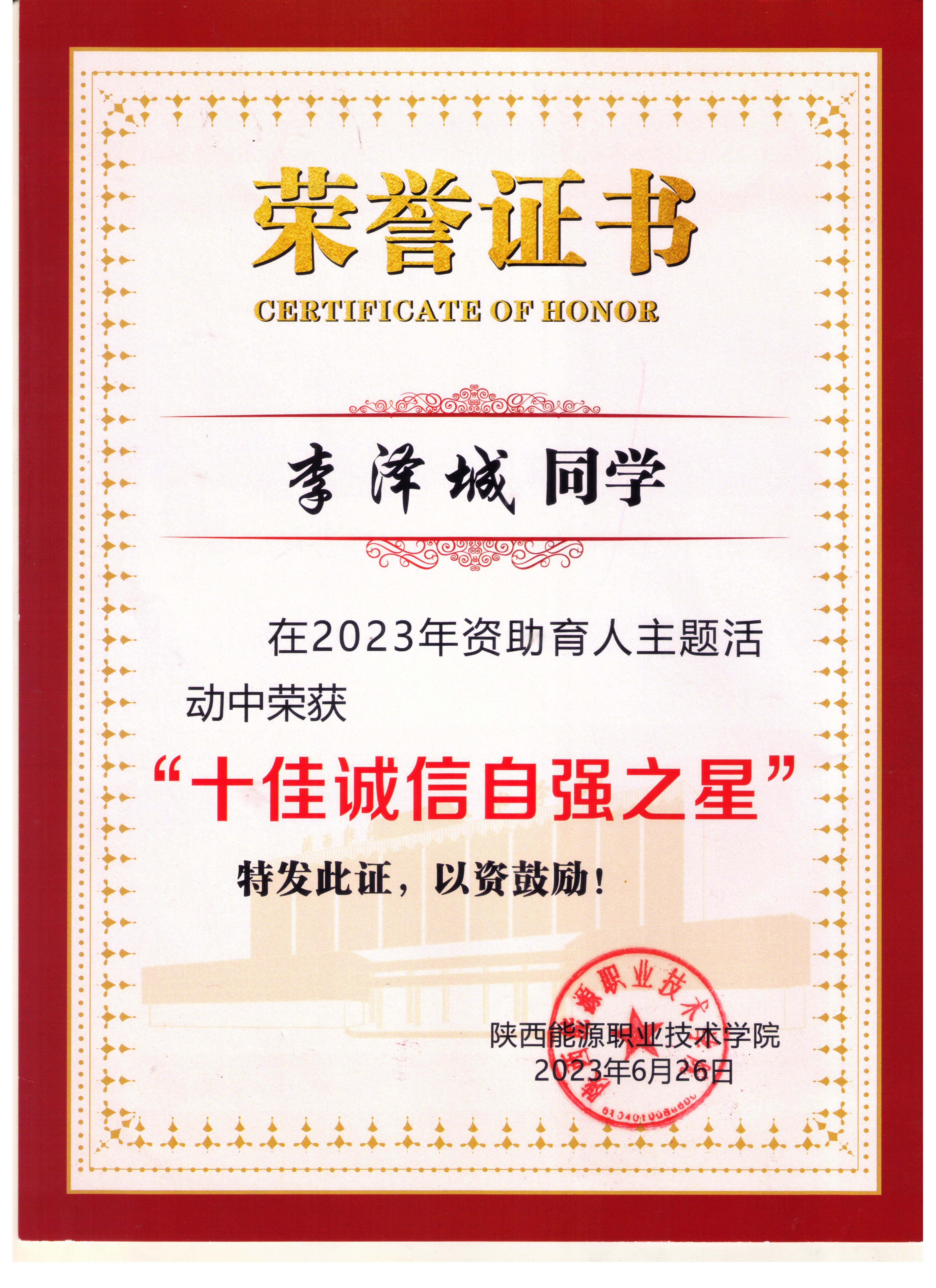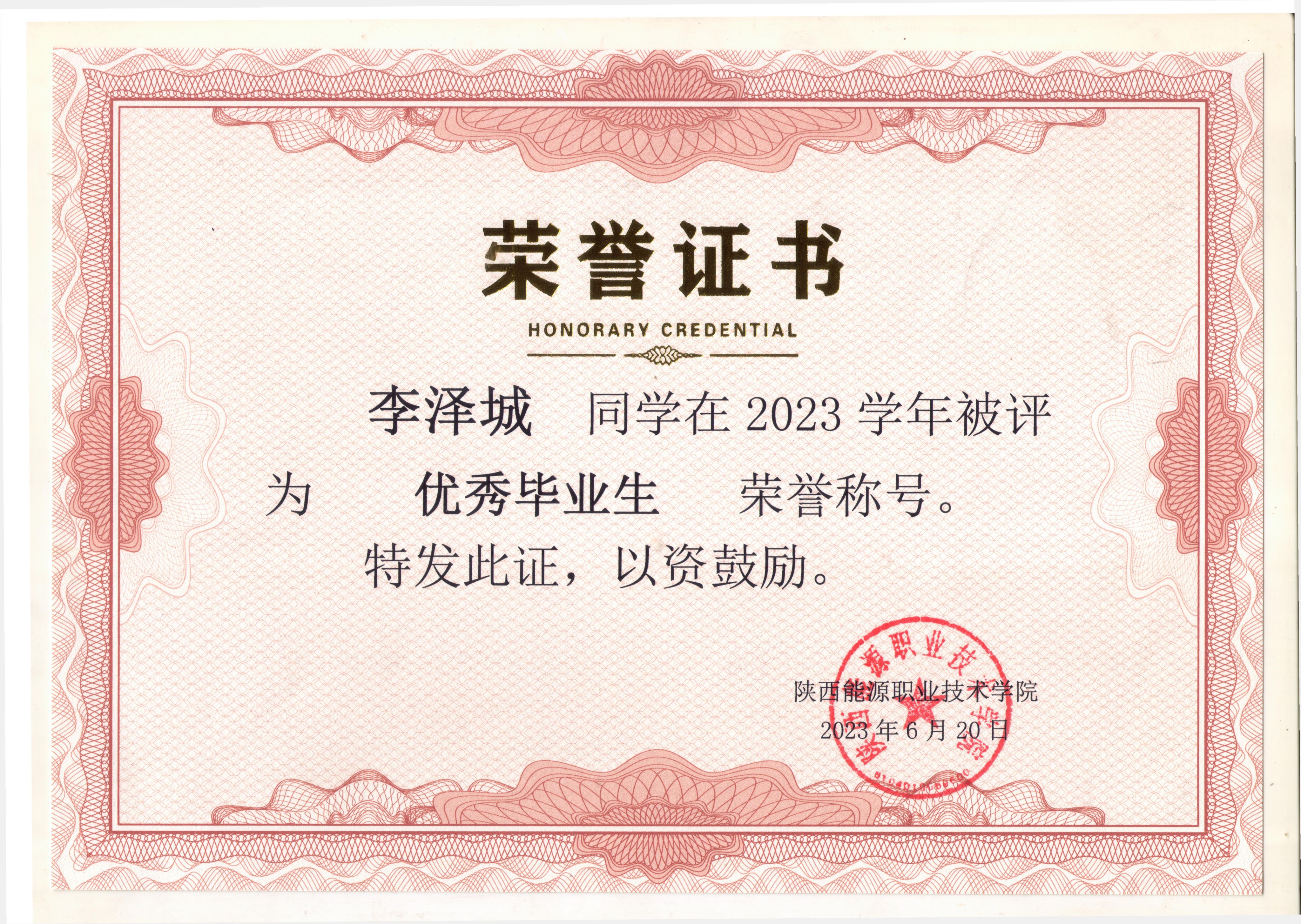 2.2023年7月获陕西省优秀学生干部荣誉称号;