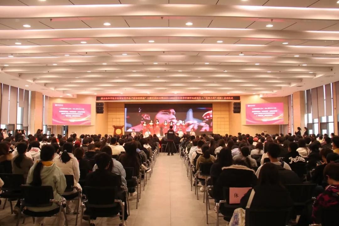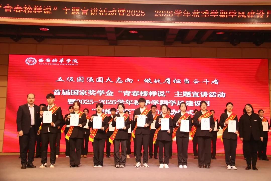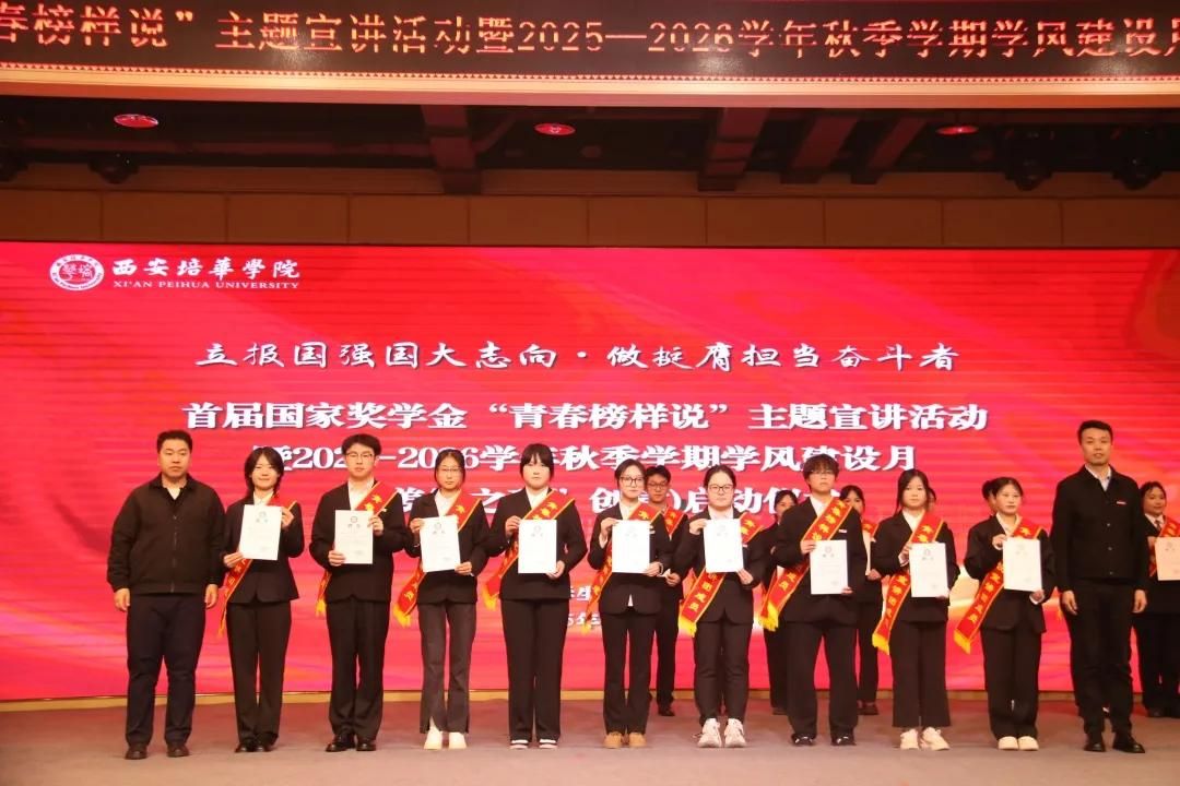 青春因远大志向而坚定,人生因不懈奋斗而精彩。“立报国强国大志向,做挺膺担当奋斗者”,是时代赋予青年学子的使命召唤,而“姜维之班”的创建,正是传承榜样精神、厚植优良学风的生动实践。为进一步加强学风建设,深化德育工作,营造优良育人环境和学习氛围,增强行为规范养成教育的实效性,我校于10月29日下午16:40在恒友楼报告厅开展“西安培华学院首届国家奖学金“青春榜样说”主题宣讲活动暨2025-2026学年秋季学期学风建设月(“姜维之班”创建)启动仪式”。党委学工部部长权勇太,党委学工部副部长杨媛,校团委书记董莹,各二级学院党委(党总支)书记(副书记)、辅导员代表、国家奖学金获得者以及300名学生代表参加本次大会。会议由会计与金融学院辅导员寇方译老师主持。