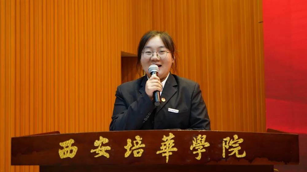 新聘任学长会计与金融学院舒锐发言,她为大家分享了一年前刚入校时受到学长帮助的心路历程,她表示作为新一届“学长们”,她们接过了上届“学长”手中的接力棒,就必将会把“学长”的精神一直传承下去,以身作则,树立良好形象,为其他同学起到模范带头作用。