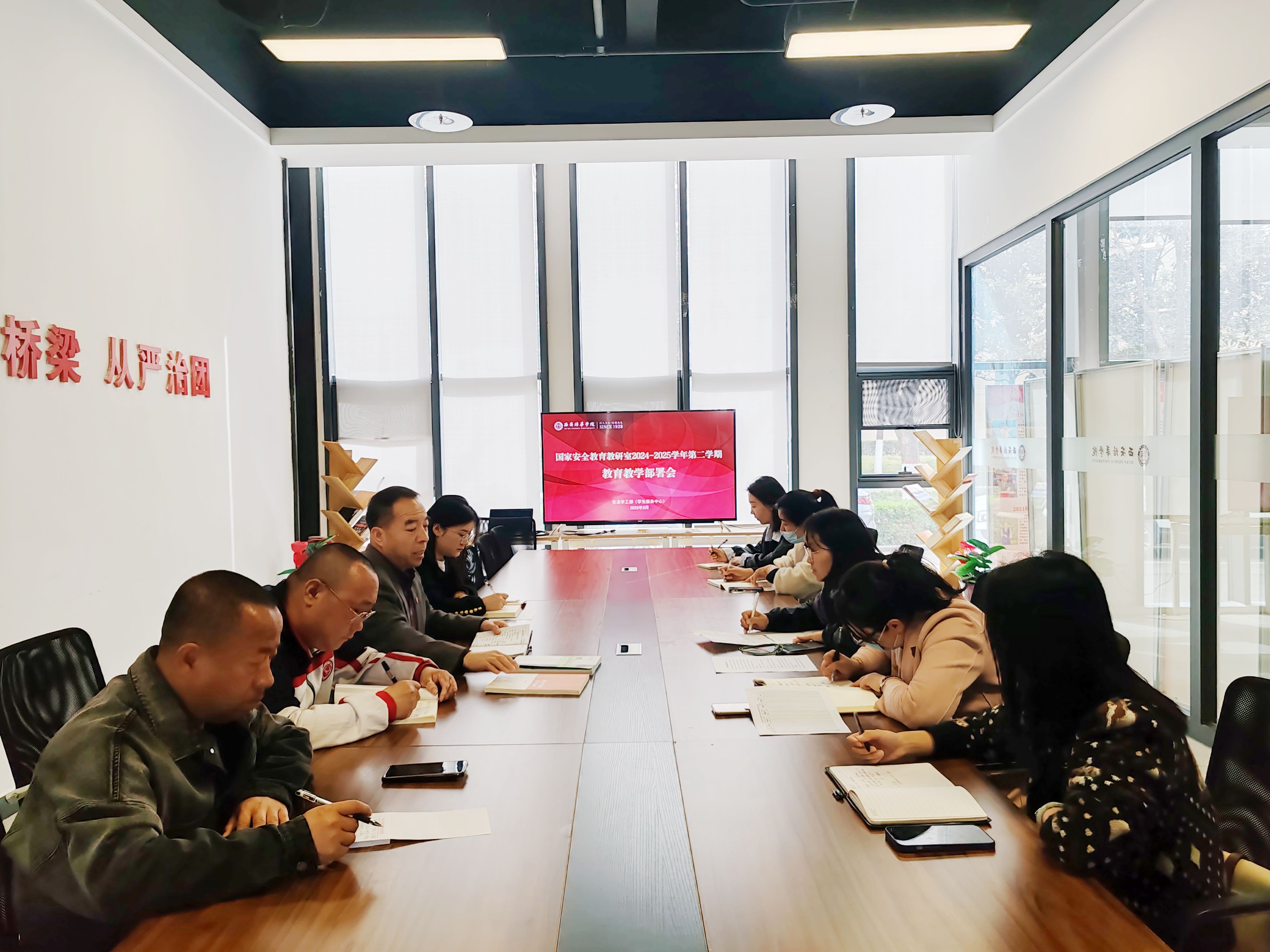 为深入贯彻总体国家安全观,进一步推动国家安全教育进学校、进课堂、进头脑,3月26日上午,国家安全教育教研室在恒友楼北会议室组织召开了本学期国家安全教育课程教学部署会。教研室主任王宏社主持本次会议、全体任课教师及教学干事参加会议,围绕国家安全教育课程教学的各项工作展开深入交流与部署。