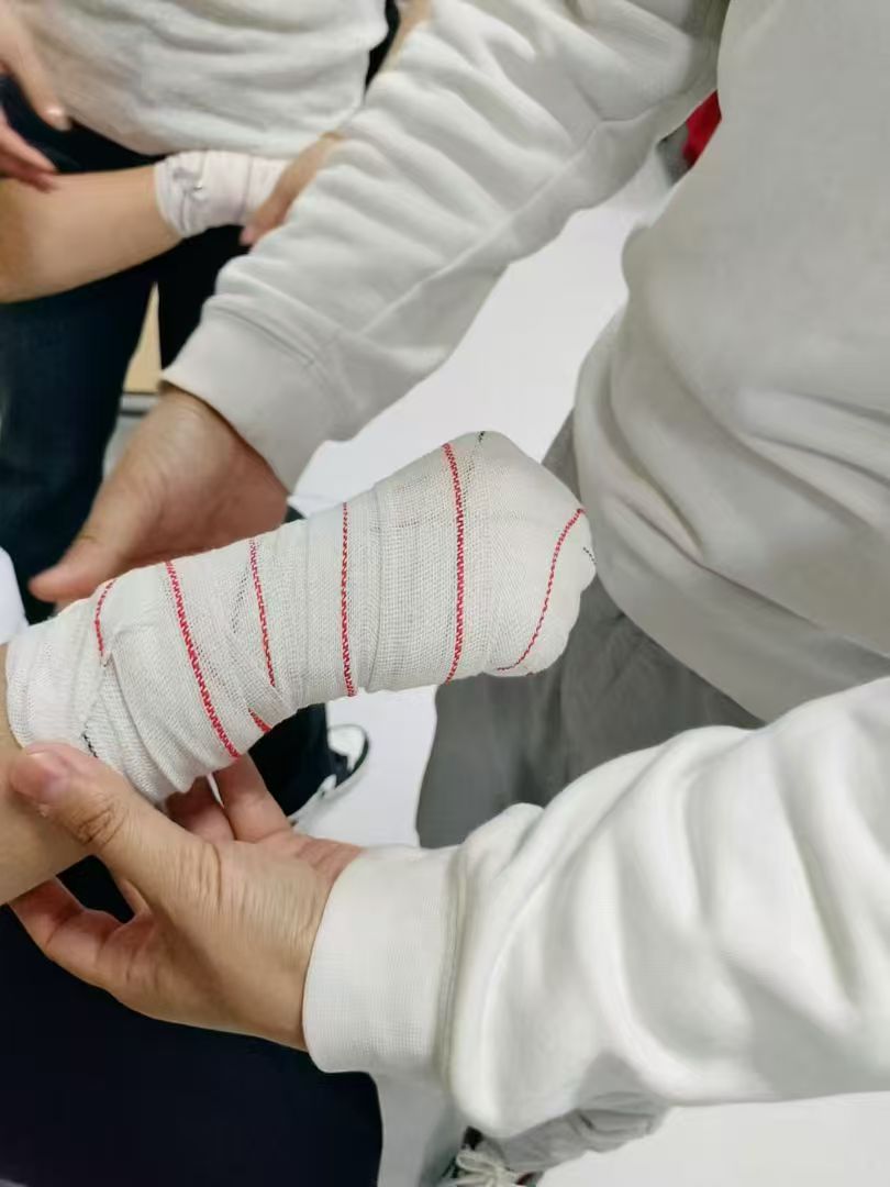 前期通过调研了解到,不少学生因经济原因从未接触过专业急救培训,而大学生活中可能遇到运动损伤、突发疾病、社会实践意外等场景,对急救技能的需求迫切。为此,学校不仅全程免除培训费、材料费,还为参训学生配备了急救手册、三角巾、碘伏棉签的实用急救包以及模拟训练道具等学习资料,让大家学得安心、用得方便,确保学生“零负担”参与。