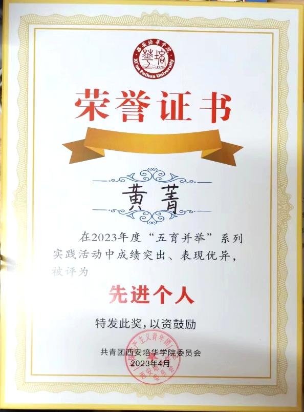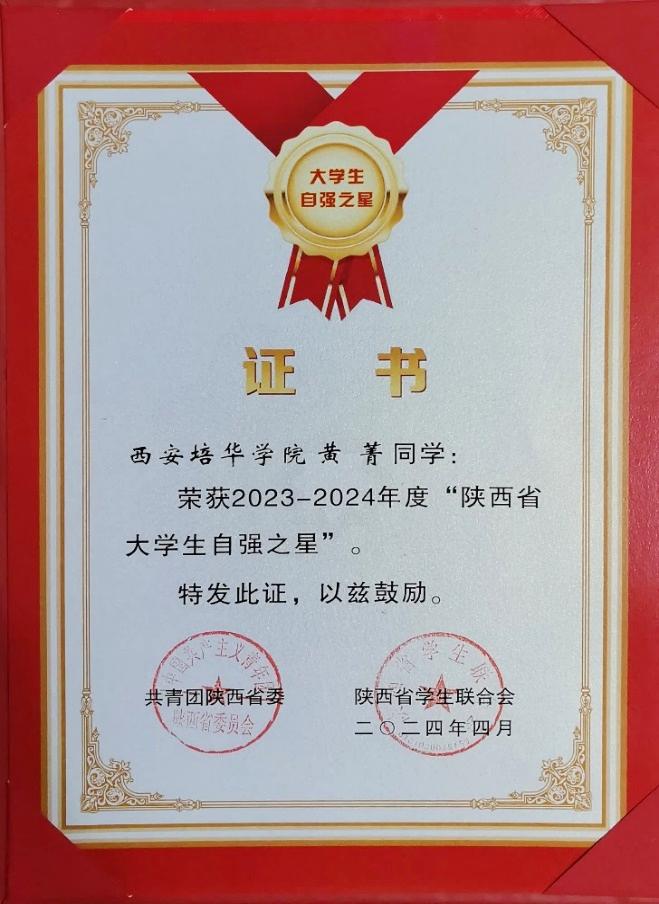 黄菁,女,汉族中共党员,会计与金融学院会计学本科生,现担任西安培华学院学生会执行主席、西安培华学院云梯青年宣讲团成员、会计与金融学院会计学专业代言人、会计学2102班团支书,曾获评“全国大学生自强之星”、 陕西省学联学生会先进工作个人、校三好学生、优秀共青团员、优秀共青团干、新时代好青年、大学生年度人物等荣誉称号。
