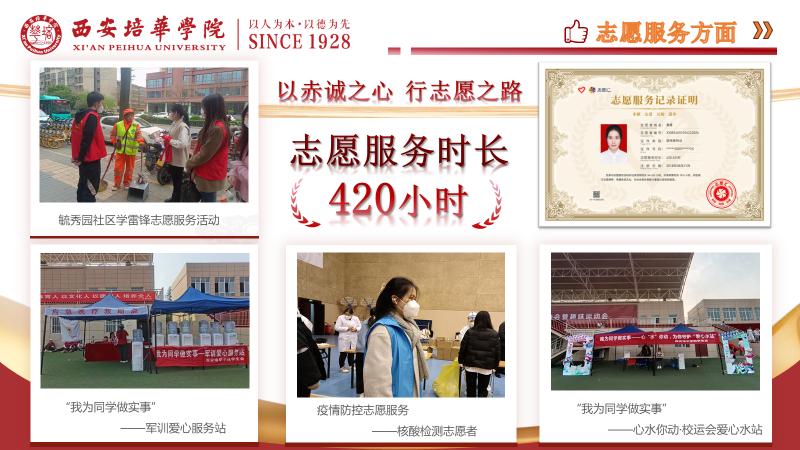 寒假返乡后她前往中共浙皖特委革命旧址,作为红色讲解员讲述家乡故事;暑假期间参与三下乡社会实践中活动,带领团队获得团中央立项2项,进入乡村基层,拍摄《银州印象》系列米脂宣传短片,以青春之声讲述米脂故事。(各级媒体报道40余篇,乡村宣传短片8部,累计服务人数超1000人,赴4地6村走访调研,形成两篇调研报告)她积极参与学校、社区志愿服务,组织开展“我为同学做实事”系列志愿服务活动10余场;个人志愿时长达500小时。创新校长接待日沟通模式,建品牌丰富校园文化生活,获评“2023年度陕西省学联学生会先进工作个人”。作为西安培华学院宣讲人代表参与陕西高校青年“喜迎二十大”联合宣讲会、“这十年·青年讲”高校联合宣讲会,以青言青语讲述中国故事。打造“朋辈榜样宣讲团”、组织经验分享会7次,从学科竞赛、创新创业、考研考公等多方面,树榜样促进学风建设;组织专题学习会、读书分享会6次,强化思想引领。参加榜样分享会8场,以朋辈之力量,行青春之互助。主持大学生创业训练项目1项,参与“互联网+”大赛2项,获省级铜奖1项,校级荣誉3项。以第一作者在发表论文 1 篇,并被知网收录。