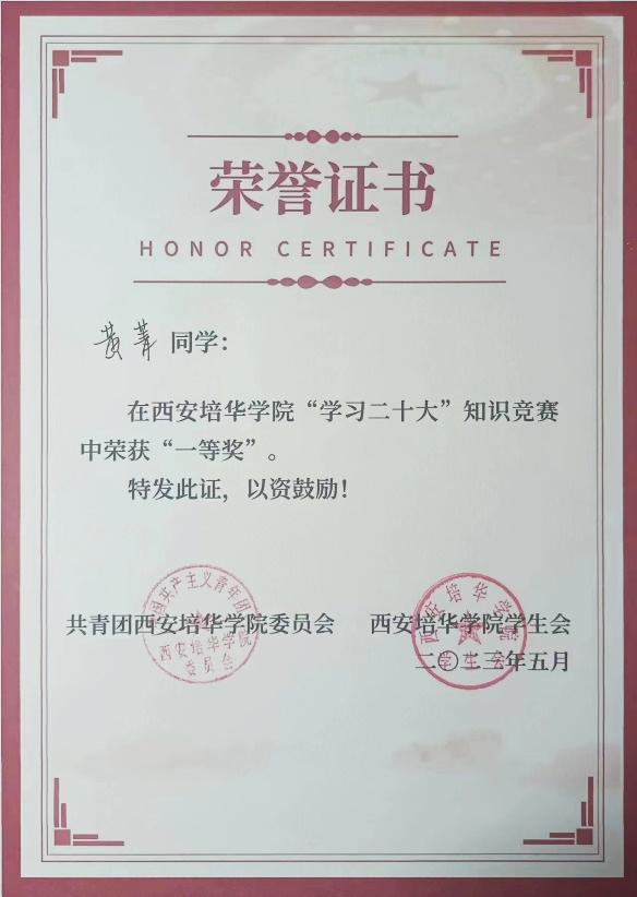 她严于律己,注重思想政治与理论学习,成为陕西省青马工程第十七期高校班学员,赴革命圣地延安开展红色教育和实践锻炼,她作为班级团支书,积极推进支部建设,组织开展团员青年主题教育,带领同学们以集中学习、小组研讨、读书分享会等形式进行专题学习活动6次,开展丰富多彩的主题团日活动和团课40余次,带领支部获评“五四红旗团支部”等荣誉。