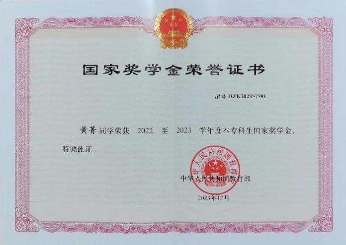她学业水平优异,连续三年位于专业前3%,90分以上科目42门,获2022-2023学年、2023-2024学年国家奖学金、中国大学生自强之星奖学金、校一等奖学金、力学奖学金、学科竞赛奖学金等,通过了大学英语四级、会计专业技术资格(初级)证书。辅修播音与主持艺术专业,并考取普通话水平测试二级甲等证书。