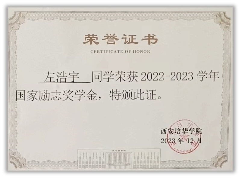 在课余他积极参与各类竞赛,通过竞赛,不断挑战自我,突破自我,将所学知识转化为解决实际问题的能力。在第八届陕西省学生“学宪法 讲宪法”大赛暨国赛选拔赛中他荣获高校组二等奖,总分第二名,为培华取得了历届以来最好的一次成绩。在西安培华学院大学生讲思政公开课大赛中荣获二等奖。参加西安培华学院第十五届“名花有主”求职大赛荣获校级总决赛三等奖。西安培华学院首届大学生职业规划大赛(就业赛道)三等奖。所参与的中国国际大学生创新大赛《有“才”有“财”》项目获陕西赛区省级铜奖、校赛二等奖,《孟孟体育:一家只做中考体育的训练营》项目获校赛二等奖,大学生创新训练计划《以酒为媒——传承酒海技艺》项目获省级立项、推荐为国家级立项。