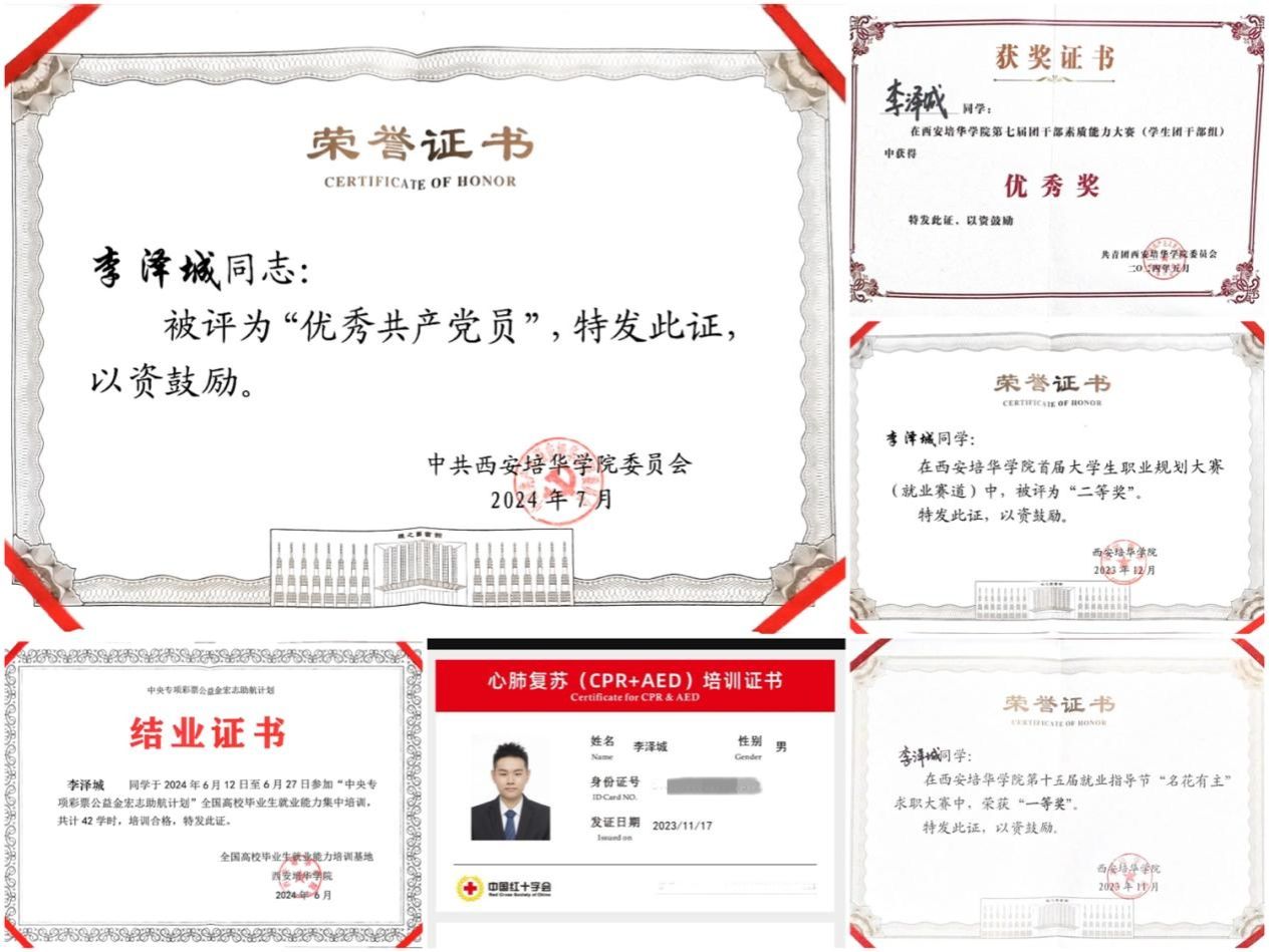 李泽城,中共党员,医学院医学检验技术本科生,现担任西安培华学院2023医检(专升本)01班班长,学生第二党支部组织委员,陕西国家奖学金青春榜样团成员,陕西能源职业技术学院校友理事。精诚为医,学业水平优异,2023-2024学年专业第一,2020年学业成绩始终保持专业第一。曾获国家级奖项6项省市级奖项3项。校级奖项20余项。先后入选中华全国学联、三秦学子陕西学联公众号中国大学生自强之星、陕西省大学生自强之星名录。个人事迹先后被中国学生资助、陕西省教育厅、中华网等校级以上媒体报道共10余次。