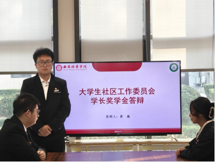 为进一步发挥学长在学生自我教育、自我管理、自我服务、自我监督中的主体作用,充分调动学长工作的主动性、积极性,进一步落实《西安培华学院学长奖学金评定办法(试行)》,秉承公平、公正、公开的原则,大学生社区工作委员会于2024年11月8日举行了2023-2024学年“社区学长”奖学金竞选答辩会。
