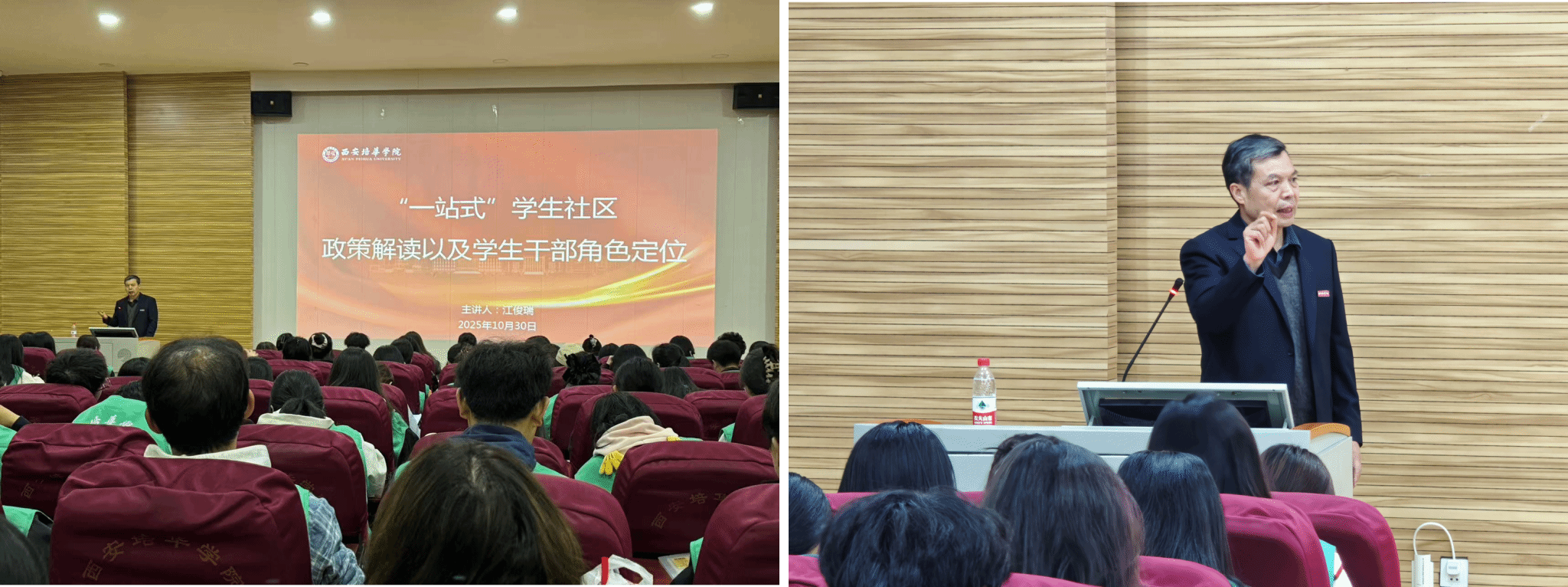 “一站式”学生社区主管领导江俊瑞,以“一站式”学生社区政策解读以及学生骨干角色定位”为主题,围绕社区建设的核心政策展开深入讲解,明确学生骨干在社区管理、服务同学、连接师生中的重要职责,引导大家树立服务者和桥梁者的角色意识,为今后开展工作找准方向。