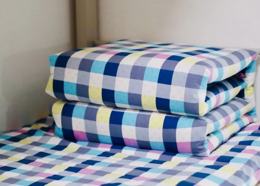 1、床上:起床后必须叠被子,宿舍内所有被子统一顺序摆放,放于床尾。床铺要平整,床上无凌乱杂物和衣服。小件饰品(毛绒玩具等)必须靠墙一侧整齐摆放在床上。床沿不得乱挂衣物,严禁将电源插线板放置在床上使用。