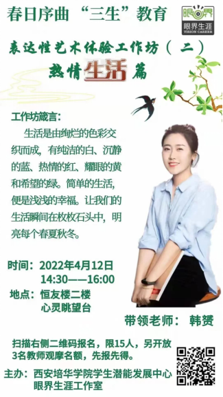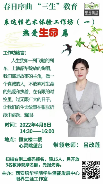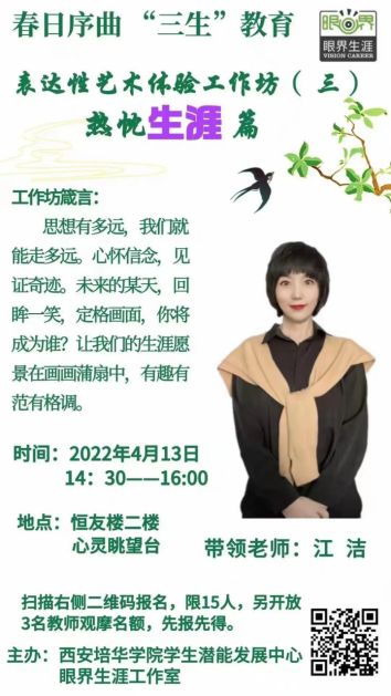 以“春日序曲,‘三生’教育”为主题的表达性艺术体验工作坊已圆满结束!此次活动以多种艺术表达形式,帮助学生在体验过程中得到情绪情感地表达、自我觉察、人格的不断完善与成长。