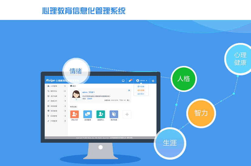 瑞格心理信息化管理系统由我校专为学生心理测评购买,不仅包含常用人格、情绪、智力和心理健康常用八十多个专业问卷,还包含指导学生进行职业探索与职业规划,提供专业化的职业测评工具、学科兴趣测评、学科能力评估与意向专业覆盖率的学科报告,提供权威的“职业信息库”、“专业库”;提供职业组合卡、职业彩虹图、家族生涯树等多种生涯训练;帮助学生认识自我、职业探索、选科决策,确立职业理想。