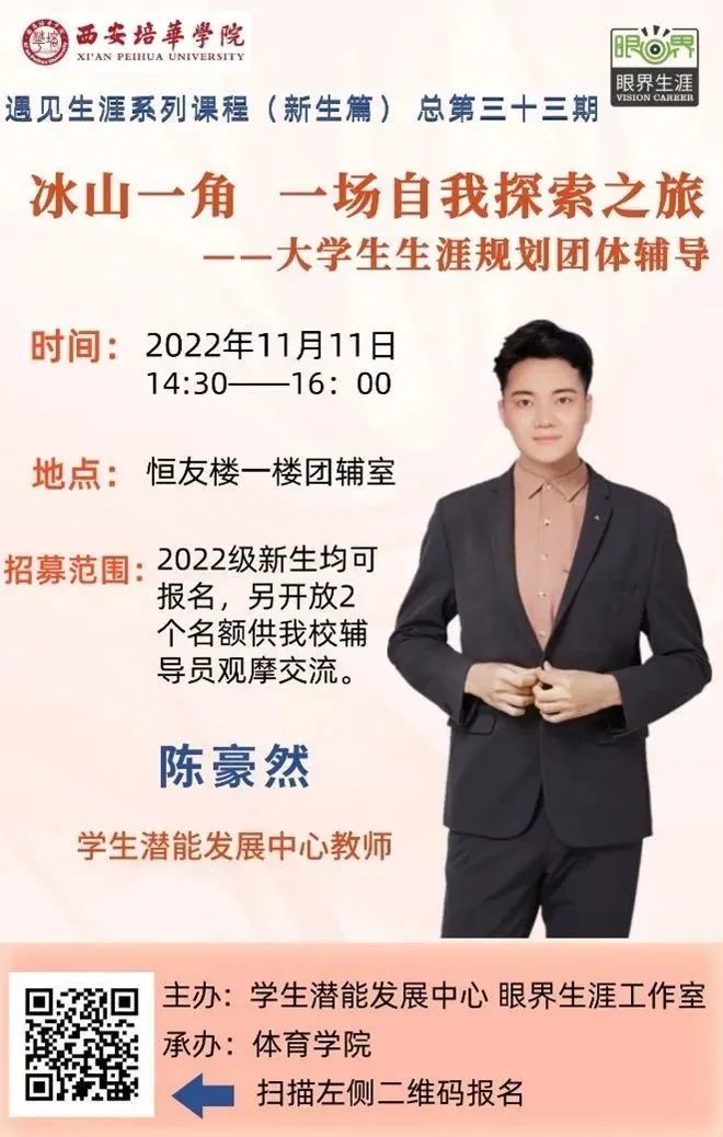 2022年11月11日14:30-16:00,由学生潜能发展中心、眼界生涯工作室主办,体育学院承办的遇见生涯系列课程,暨《冰山一角——一场自我探索之旅》大学生生涯规划团体辅导,于恒友楼一楼团体辅导室如期开展。此次团辅活动旨在引导新生通过对自我进行探索,提高对自我的认知,准确规划未来!