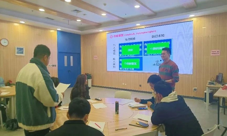 活动进行中,体育学院冯鑫老师率先积极分享了学生和自己共同探索出的成果——不同的自己:“开放我”、“盲目我”、“隐秘我”、“未知我”。随后各个小组都展开了热烈的讨论并积极交流分享。通过大家的分享,新生也更加熟悉了同学,同时也更加全面的了解了自己。
