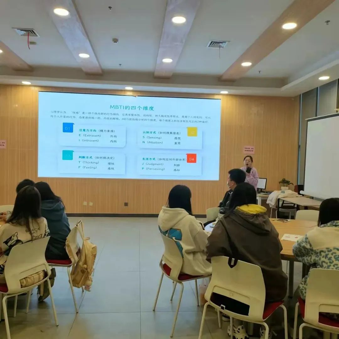 其次潘老师讲解了MBTI的四个维度,让同学们对于性格认识更全面。性格是大学生自我探索的重要内容之一。大学生需要关注自己性格方面的特点,来帮助自己建立正确的生涯规划。
