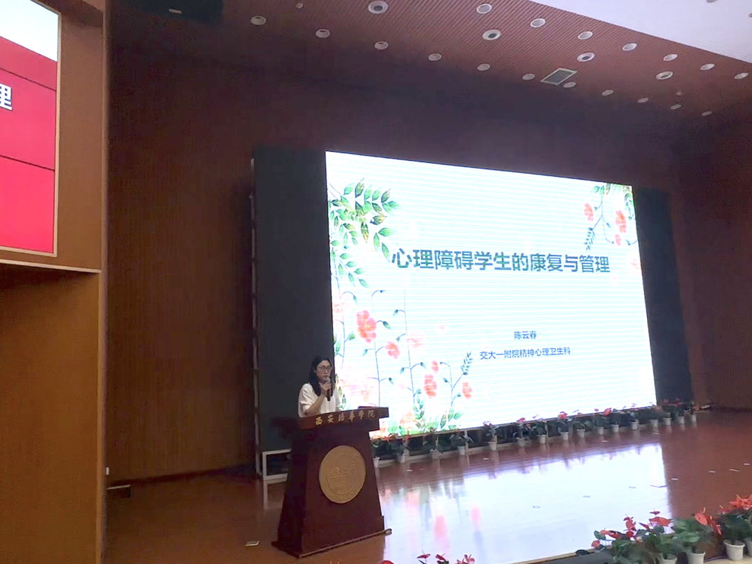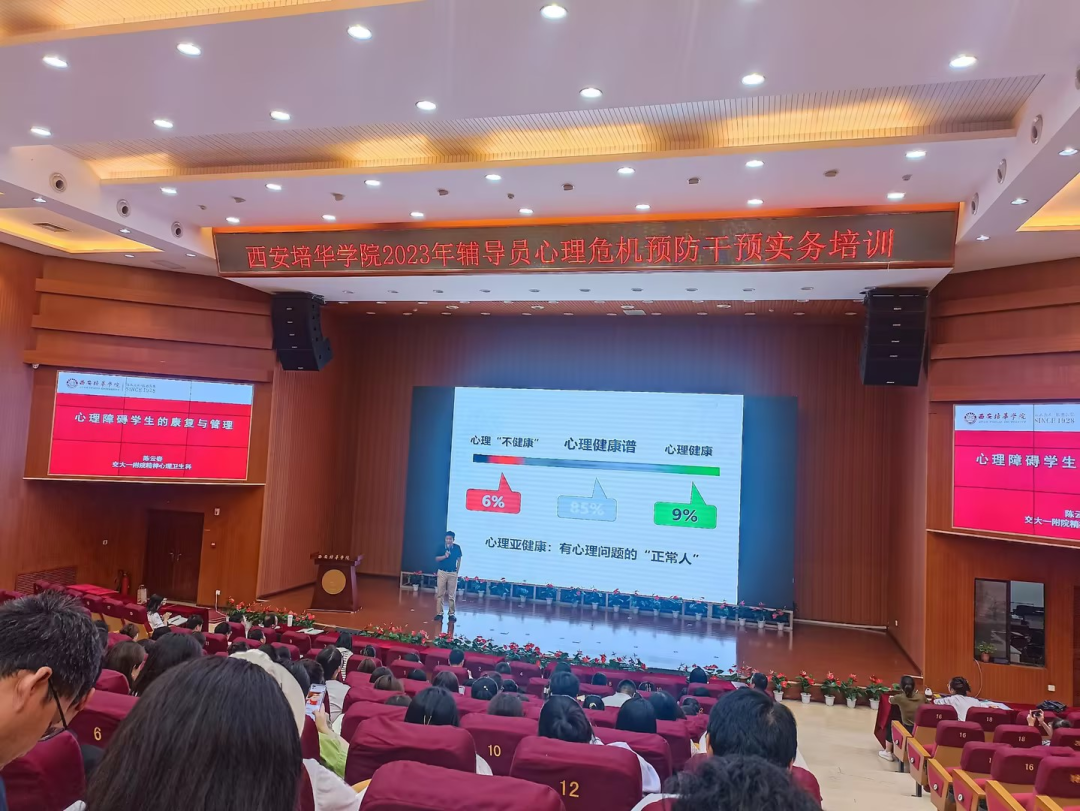 本次培训会特邀交大一附院精神心理卫生科主任陈云春教授于2023年9月15日14:30在校图书馆报告厅就《心理障碍学生的治疗和后期干预》做了专题培训,培训由韩赟主任主持,学生潜能发展中心主任韩赟、全体辅导员及学生潜能发展中心等百余名老师参加了培训。