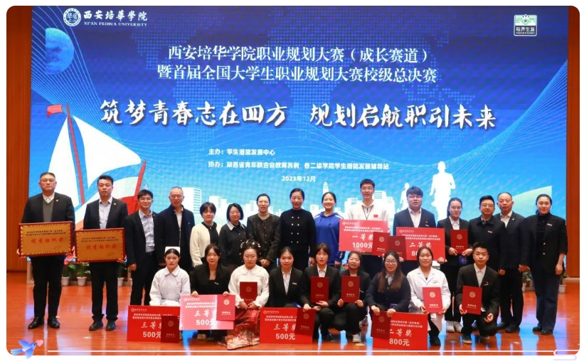 西安培华学院职业规划大赛(成长赛道) 暨首届全国大学生职业规划大赛校级总决赛于12月20日在维之图书馆报告厅顺利举行。本次大赛由学生潜能发展中心、眼界生涯工作室主办,陕西省青年联合会教育界别、各二级学院学生潜能发展辅导站协办。大赛的举办旨在以赛促学、以赛促教、以赛促就,帮助学生明确职业发展方向,树立正确成才观、职业观和就业观。