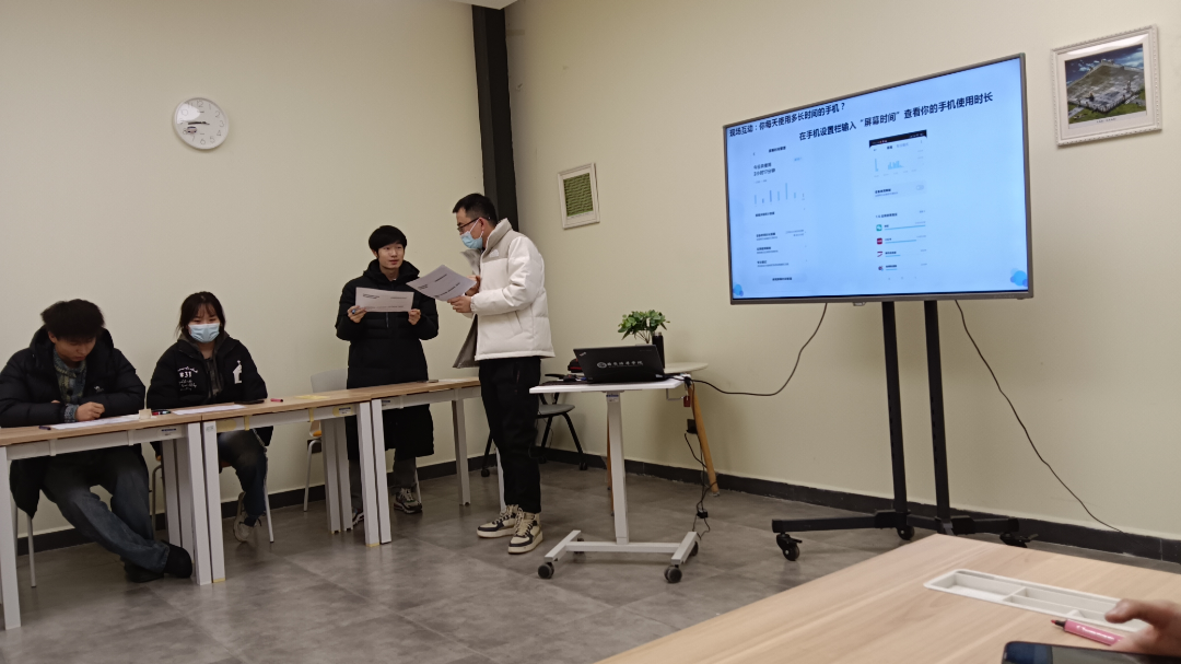 为了让学生们更加直观地了解自己的手机使用情况,活动现场特别设置了一个互动环节一一学生们被要求在手机设置栏输入“屏幕时间”,查看自己的手机使用时长,并据此制作自己的手机使用情况小卡片。根据学生的手机使用情况,现场将学生分成了视频组、游戏组、聊天组。让参与学生更清晰地认识到自己在使用手机时的主要行为模式,从而有针对性地找到摆脱手机依赖的方法。