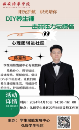 由陈豪然老师进社区开展的心理团体辅导是针对体育学院学生开展的策划活动,对于日常较强的运动量,身体和心理的放松都显得尤为重要。借以DIY手作的形式,将健康带给学生,把温暖带进社区。让学生在制作手工的过程中得到心理的放松、压力的释放;而制成的养成锤,可以帮助学生疏通经络、缓解运动后的疲劳和酸痛。希望这个喜闻乐见的小锤,能够帮助同学们击碎压力与烦恼,积极乐观面对生活中的负性事件,创造健康温暖的生活。
