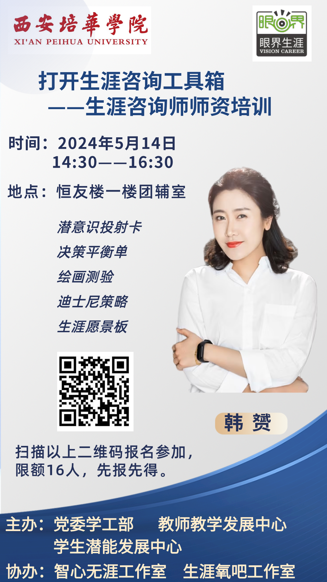 2024年5月14日,由党委学工部、教师教学发展中心、学生潜能发展中心主办,智心无涯工作室、生涯氧吧工作室协办的生涯咨询工具培训在恒友楼一楼团辅室顺利落下帷幕。24名对生涯咨询领域感兴趣的教师和辅导员老师踊跃报名参与。