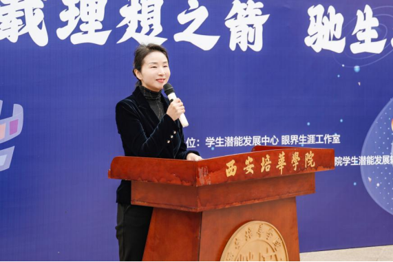 副校长姚文静致辞并宣布活动开始,她介绍了西安培华学院“蒲公英”生涯体验节的由来及发展,并对各校的老师到来表示欢迎。她表示,“蒲公英”寓意散落人间的精灵,象征着勇敢、坚持,万千学子聚在培华,潜心磨砺,希望通过本次活动让他们体验到生涯探索的魅力,逐步明确自己的生涯方向,在体验中成长,最终构建出属于自己的职业蓝图。