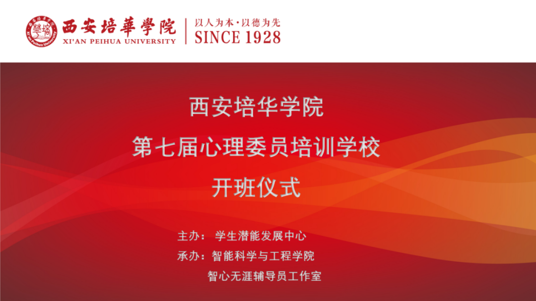 2024年10月24日在图书馆报告厅隆重举行了第七届心理委员培训学校开班仪式。此次活动由西安培华学院学生潜能发展中心主办,智能科学与工程学院、智心无涯辅导员工作室承办,参会领导和嘉宾有学生潜能发展中心韩主任,西安工程大学心理健康教育与咨询中心刘蓉主任,智能科学与工程学院党委副书记王伟平,智能科学与工程学院辅导员以及各二级学院学生潜能发展辅导站联络老师。此次开班仪式旨在提高大学生心理健康意识,培养心理委员的专业能力,以便更好地为学生成长成才保驾护航。本次活动由智能科学与工程学院辅导员高珊珊老师主持。