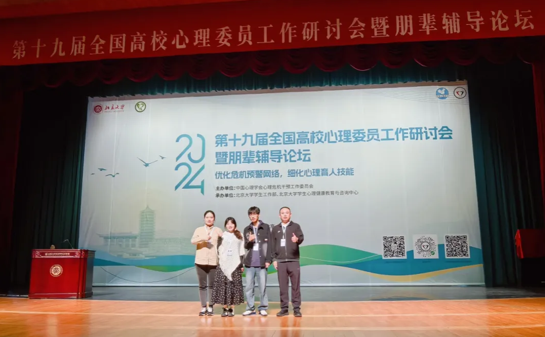 10月16日至18日,第十九届全国高校心理委员工作研讨会朋辈辅导论坛在北京大学隆重举行。来自国内外各高校专家学者、大学生心理健康教育中心专职教师、心理委员等参与了本次会议。我校会计与金融学院党委书记兼行政副院长刘斌、学生潜能发展中心专职教师王旭传媒与设计学院心理委员代表殷琦、智能科学与工程学院心理委员代表党奕琛参加了本次大会。