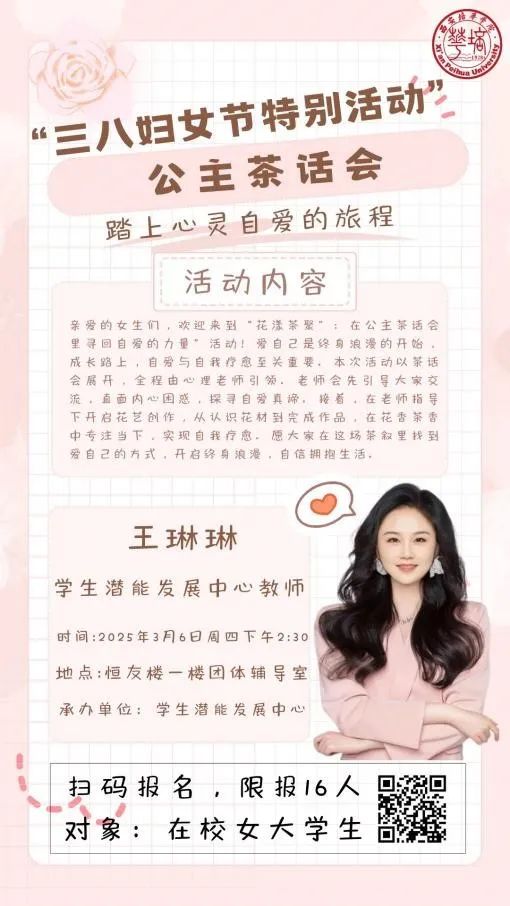 为帮助学生舒缓压力,放松身心,领悟自我价值,从而学会接纳、珍视自我,增强自信。在三八节来临之际,3月6日下午14:30,学生潜能发展中心举办了主题为“公主茶话会踏上心灵自爱的旅程”表达性艺术心理体验工作坊。本次工作坊由王琳琳老师主讲,共17名学生参与。