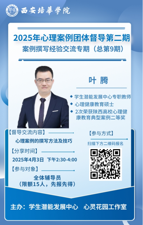 本期督导由两次荣获陕西高校心理案例二等奖的叶腾老师带领,就心理案例撰写过程中的方法和技巧进行了深入浅出的讲解。叶腾老师首先深入剖析了当前高校心理咨询的特点,如今高校心理咨询强调快速响应,多采用短程咨询模式,聚焦于解决学生面临的实际问题,提升咨询效率。咨询重点围绕学业压力、人际关系、生涯规划及情绪管理等方面,这些问题与大学生的日常生活紧密相关,对他们的全面发展影响重大。