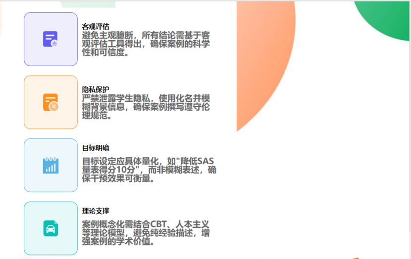 叶腾老师指出,案例撰写要突出问题类型与干预特色,如通过精心设计标题来展现案例亮点。同时,必须严格遵守伦理规范,对关键信息进行匿名化处理,保护学生隐私。在撰写过程中,要注重理论结合实践,引用权威文献增强学术严谨性,运用图表可视化数据,让干预成效一目了然。此外,还应避免主观臆断,确保所有结论基于客观评估。