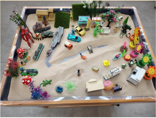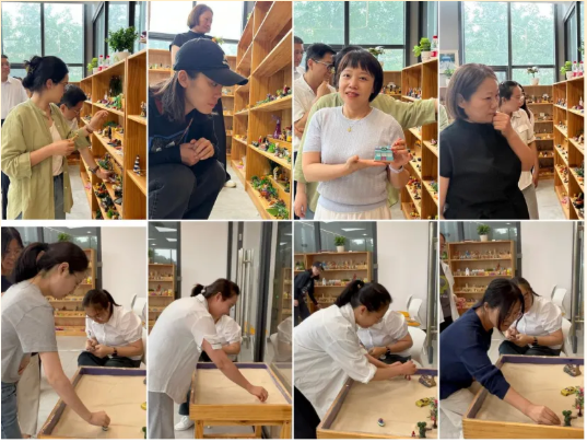 团体沙盘游戏疗法中所有来访者选择一些模型摆放在特定的沙箱里构成一些作品,从而充分表现自己的内心世界,把一些内心冲突和不良情绪无意识地释放和投射在沙盘中,进而活化自我痊愈及成长的力量达到治疗目的。经过近2小时的沙盘体验,老师们全身心地投入到团体沙盘中,通过创造沙盘世界——体验和重建沙盘世界——治疗——记录沙盘世界——连结沙游体验和现实世界。参与教师纷纷反馈,这种非言语的表达方式既保护了隐私,又实现了深度共鸣,比传统座谈会更具疗愈效果。