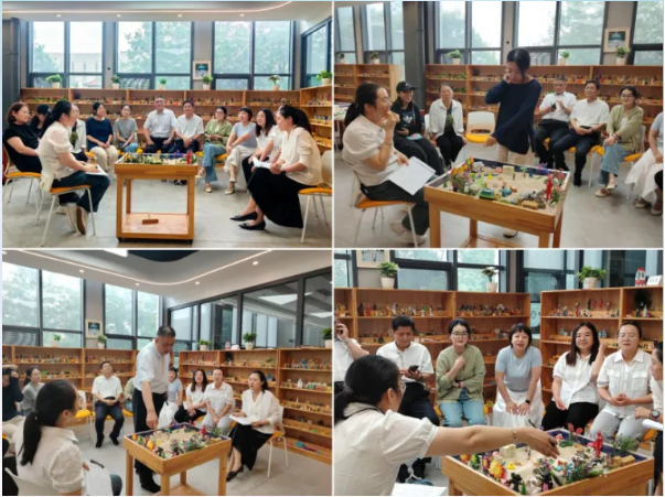 “这位老师摆放的大树,让我感到非常的触动,大树和我上一轮摆放蘑菇的场景,在自然界本身就是自然存在,这种无意识的呼应让我深受感动。”在作品解读阶段,韩赟老师和王云霞老师带领教师们从沙具选择、空间布局、物件关联等维度展开对话。当看到自己精心设计的“理想生活”与同事摆放的“安全屏障”形成奇妙共鸣时,参与的老师们纷纷感慨:“不管从什么角度出发,大家对美好生活的向往是一致的。”