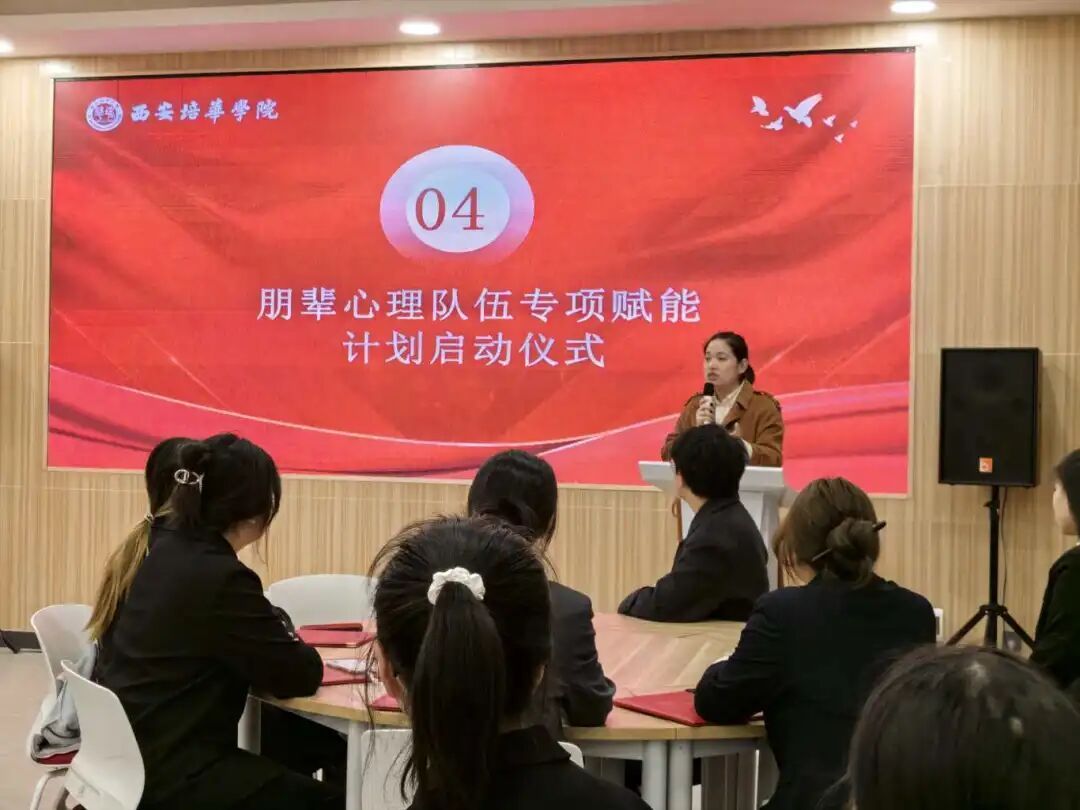 大会进入第二项由遇心涯学生互助工作委员会指导老师王旭宣读了《西安培华学院朋辈心理支持队伍专项赋能计划》的工作安排,并对此专项计划进行了详细说明。王旭老师指出,为全面提升朋辈心理支持队伍的专业素养与服务能力,本年度专项赋能计划将系统性地开展三大核心活动: