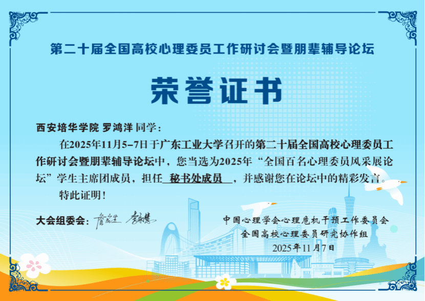 在2025年11月4日至7日于广东工业大学召开的第二十届全国高校心理委员工作研讨会暨朋辈辅导论坛上传来喜讯——我校会计与金融学院罗鸿洋同学凭借扎实的心理工作能力、积极的责任担当,成功当选第二十届全国心理委员论坛秘书处成员。
