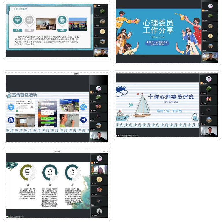 经过各心理委员对心理主题相关工作,包括集体活动、竞赛、获奖、特色活动、工作思考等方面的汇报,评委老师对基础材料与线上汇报综合评选,最终确定评选结果如下: