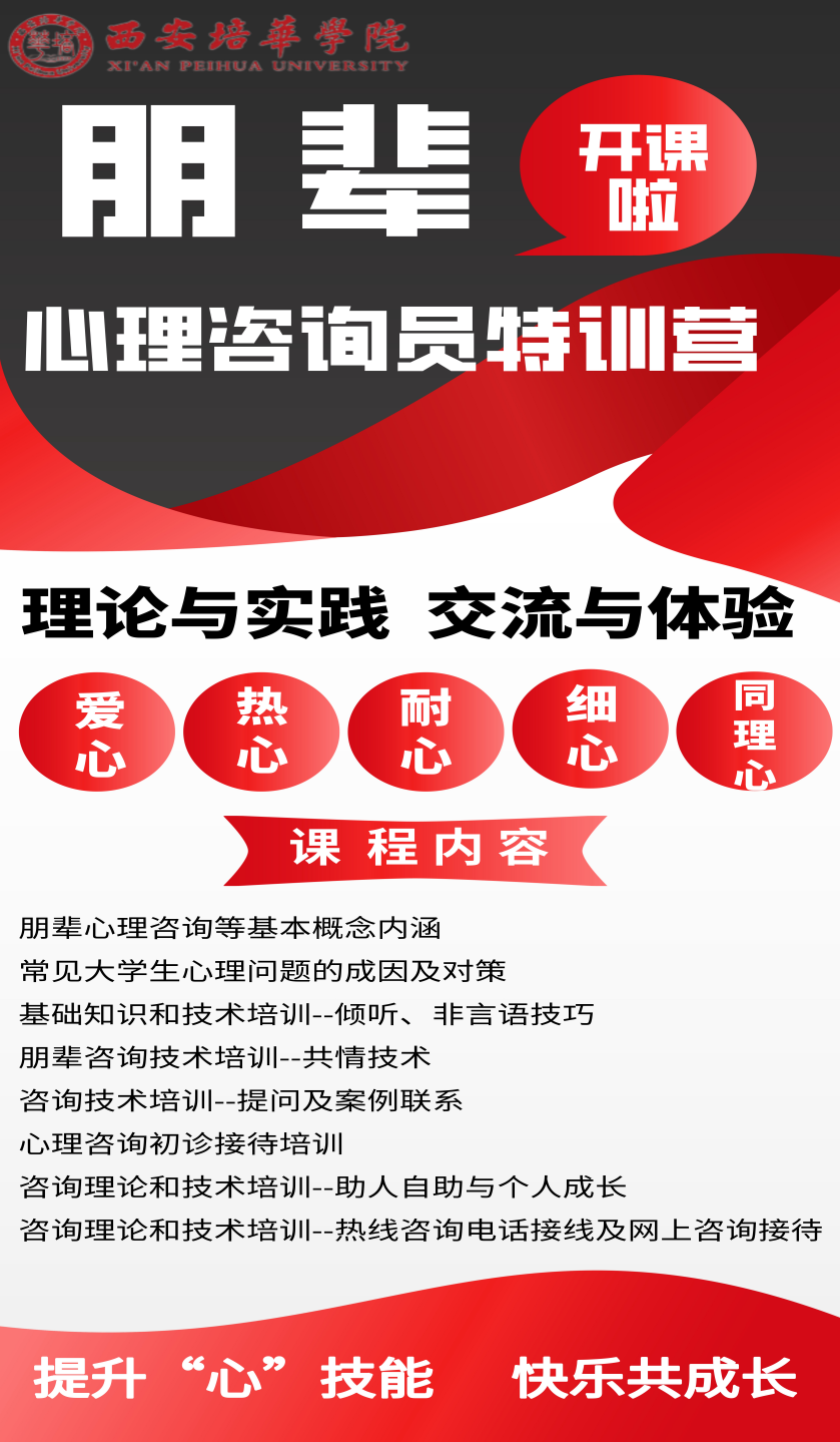 为促进心理健康知识的普及,加大对心理隐患问题学生的筛查、识别和帮扶,创建健康和谐的校园氛围,学生潜能发展中心于10月31日至11月11日将开展朋辈心理咨询员专项培训。