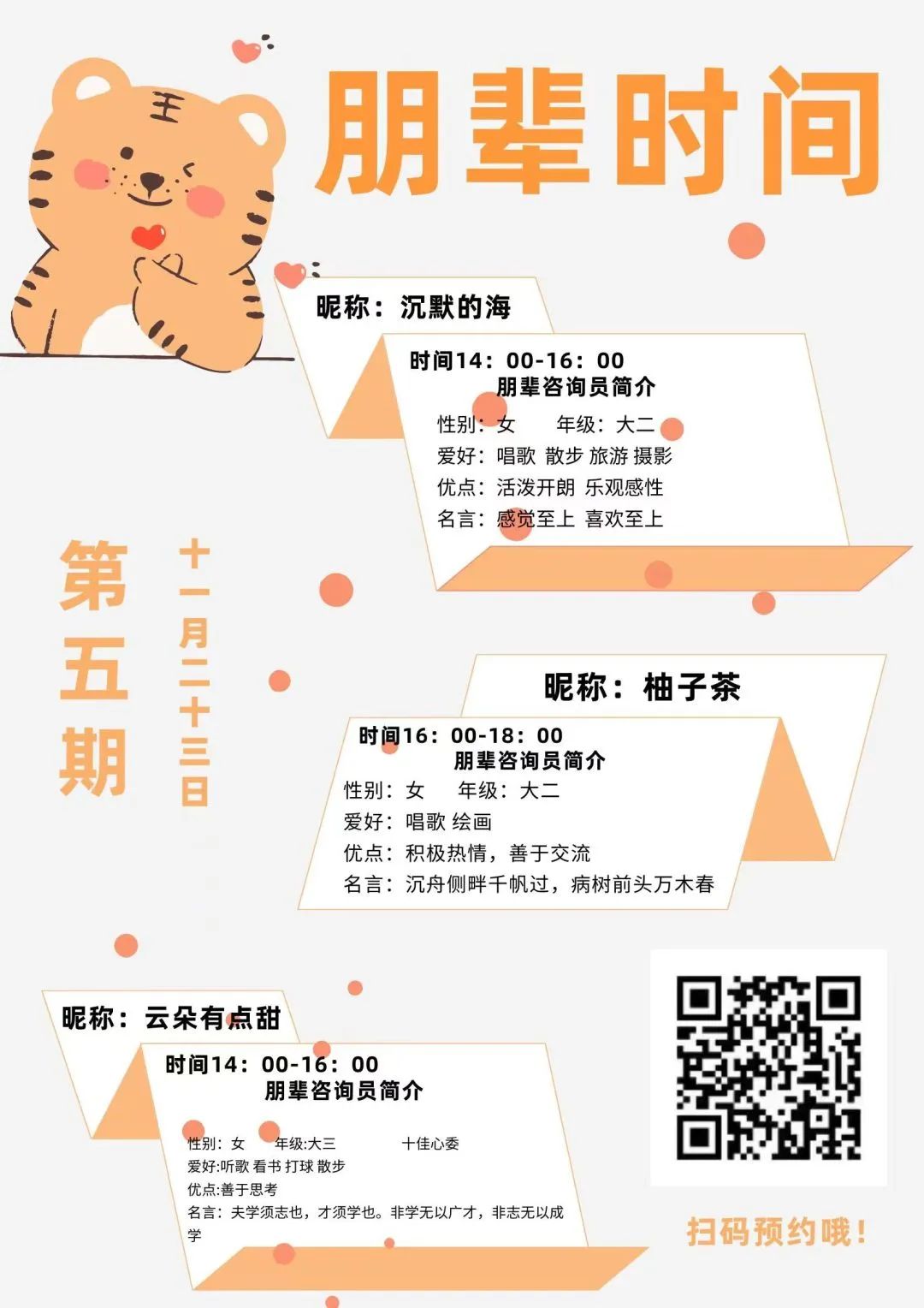 11月23日朋辈心理咨询员值班安排如下,同学们可根据自己时间按需预约