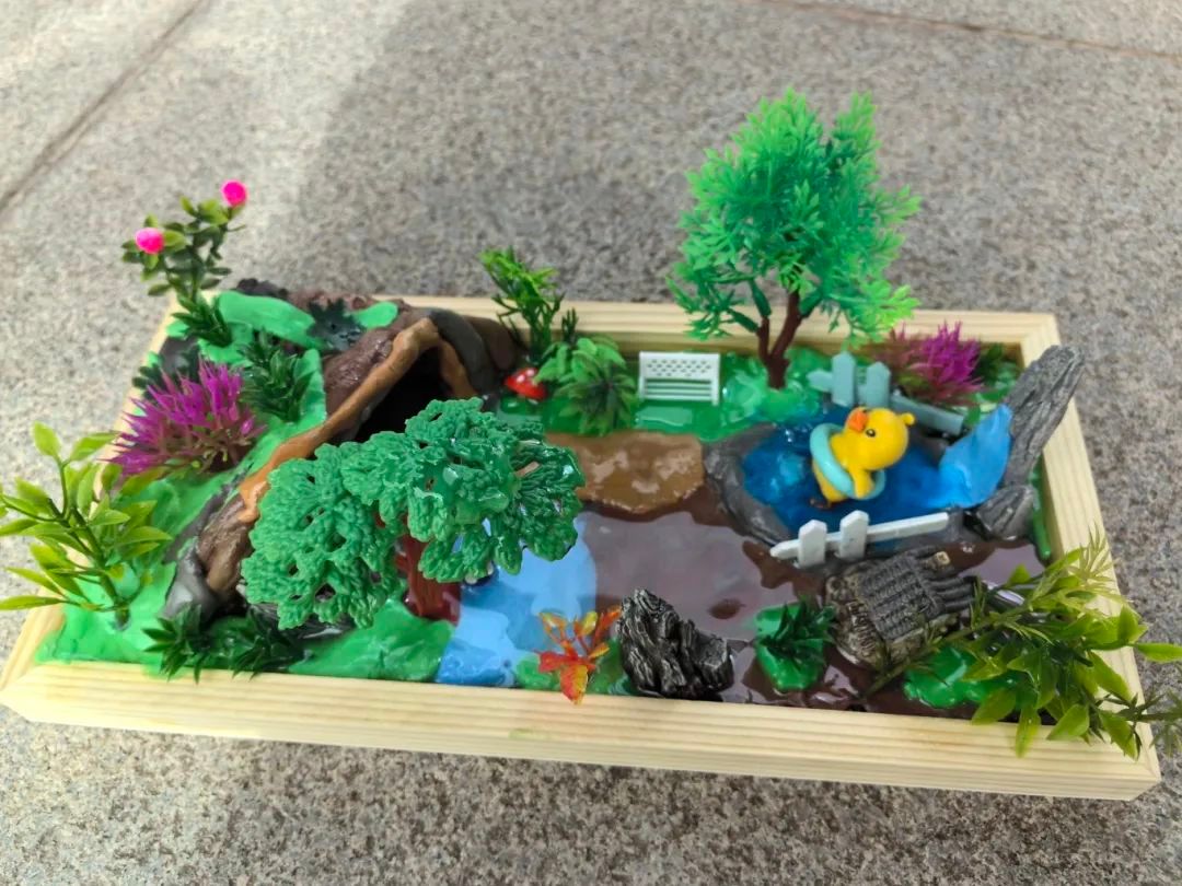 十分难得十分舒畅的体验,在快要奔二的年纪还能体验一把儿时的手工快乐。我想以一个孩子的身份思考未来的世界会是什么样子。未来是美好的,无忧无虑的,有好玩的游泳池,美丽的花草树木,是个生机盎然的世界。现实是,在未来,生活压力只多不少,与日俱增的就业压力和物价水平只会让人活得身心俱疲,这就是现代和不远的将来大部分大人的生活。而与之相对的就是自然和儿童。作品中鸭子代表着未来的我,回归童真,无忧无虑地活在大自然的世界中,摆脱繁忙,返璞归真。要想实现无忧无虑的生活,摆脱压力,实现物质上和精神上的双重满足,物质是必要的基础。那么就要努力挣钱,要努力挣钱就要努力学习。这是个十分现实也是无奈的结论,不过我们依然要乐观面对现实,向着自己的目标砥砺前行。