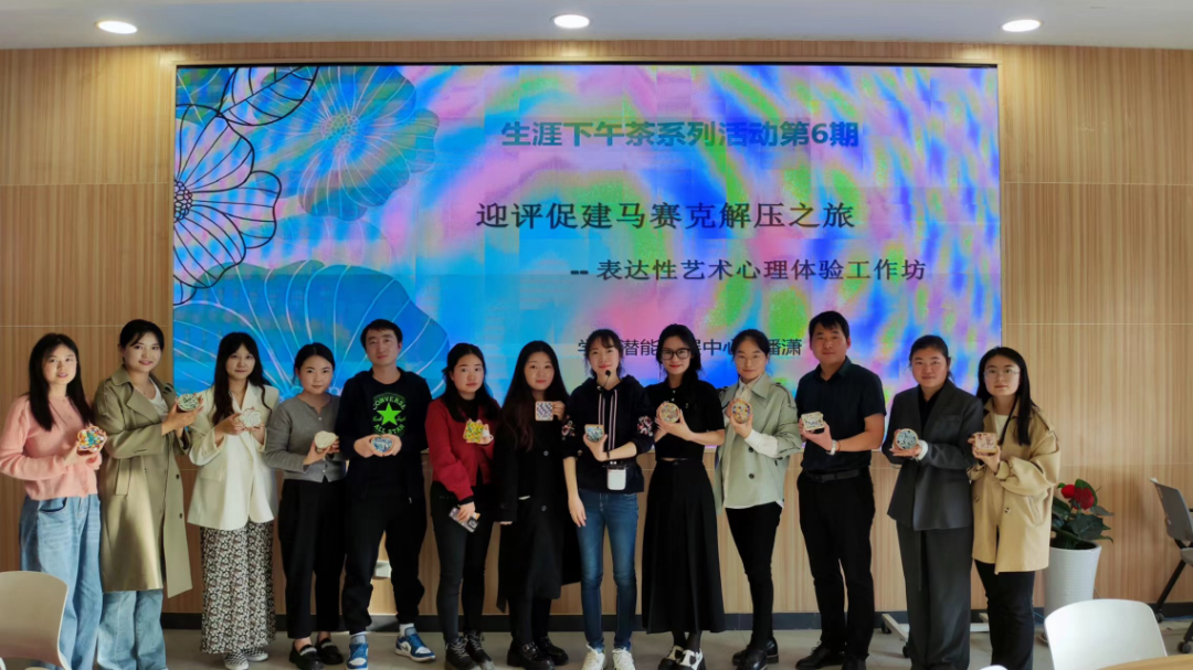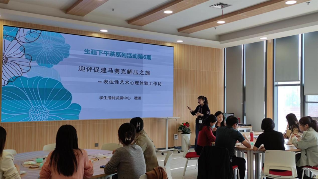 为了帮助学校辅导员队伍减轻压力,学会运用积极心理学的知识和方法,形成乐观向上、充满自信的态度,以阳光心态去生活和工作。5月11日下午16:00,学生潜能发展中心,眼界生涯工作室举办了主题为“迎评促建马赛克解压之旅”生涯下午茶第六期。本次工作坊由潘潇老师主讲,校内辅导员共计15人参与。