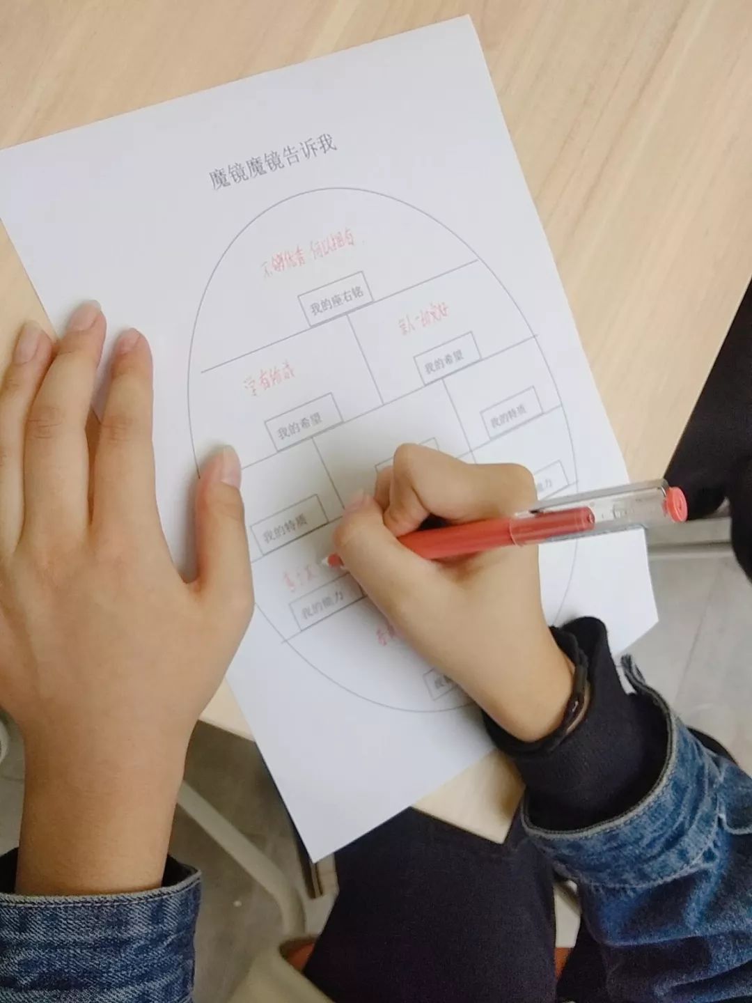 第二个练习叫“魔镜魔镜告诉我”。韩赟老师给大家每人发了一面“镜子”,大家对照这面“镜子”看清自己的特质、能力和兴趣。