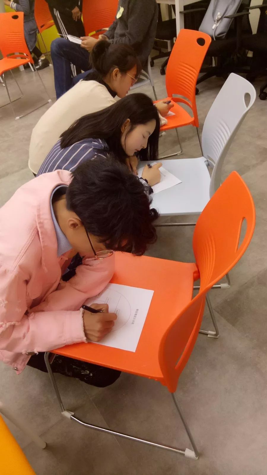 最精彩的是韩赟老师为同学们进行了“生涯幻游”的练习。首先一段轻柔的音乐响起,老师逐渐用语言将大家带入十年后的世界。随着老师言语的引导,同学们仿佛看到了十年后的自己,想象着十年后的自己一天的工作。大家的表情和姿势十分放松。渐渐的,随着音乐的停止,同学们又回到了现实。之后老师要求同学们用图画的方式展现刚才自己脑海中的场景并解释给大家听,大家都畅所欲言,气氛十分融洽。都在向老师表达着自己对未来的憧憬和向往。