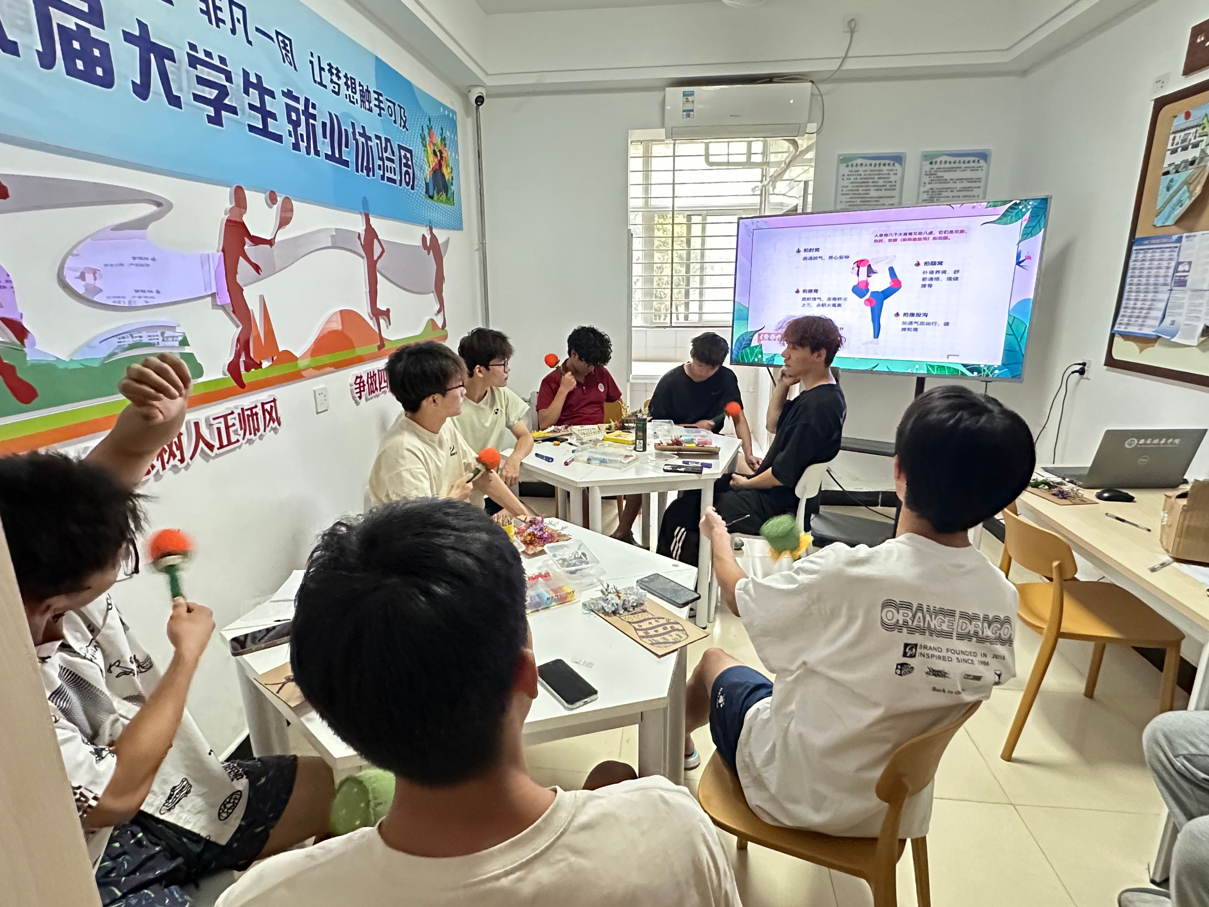 制作完成养生锤后,大家跟随视频教程,学习如何使用养生锤正确叩击人体的肘窝、腋窝、腹股沟、腘窝“等“八虚”部位以及其他身体穴位。随着养生锤一次次地落下,运动后的酸胀感与疲惫感仿佛被慢慢驱散,取而代之的是一种通体舒畅的轻松。大家相互交流按摩的感受,现场氛围温馨而热烈,每个人都在这场独特的体验中,感受到了身心的深度放松。