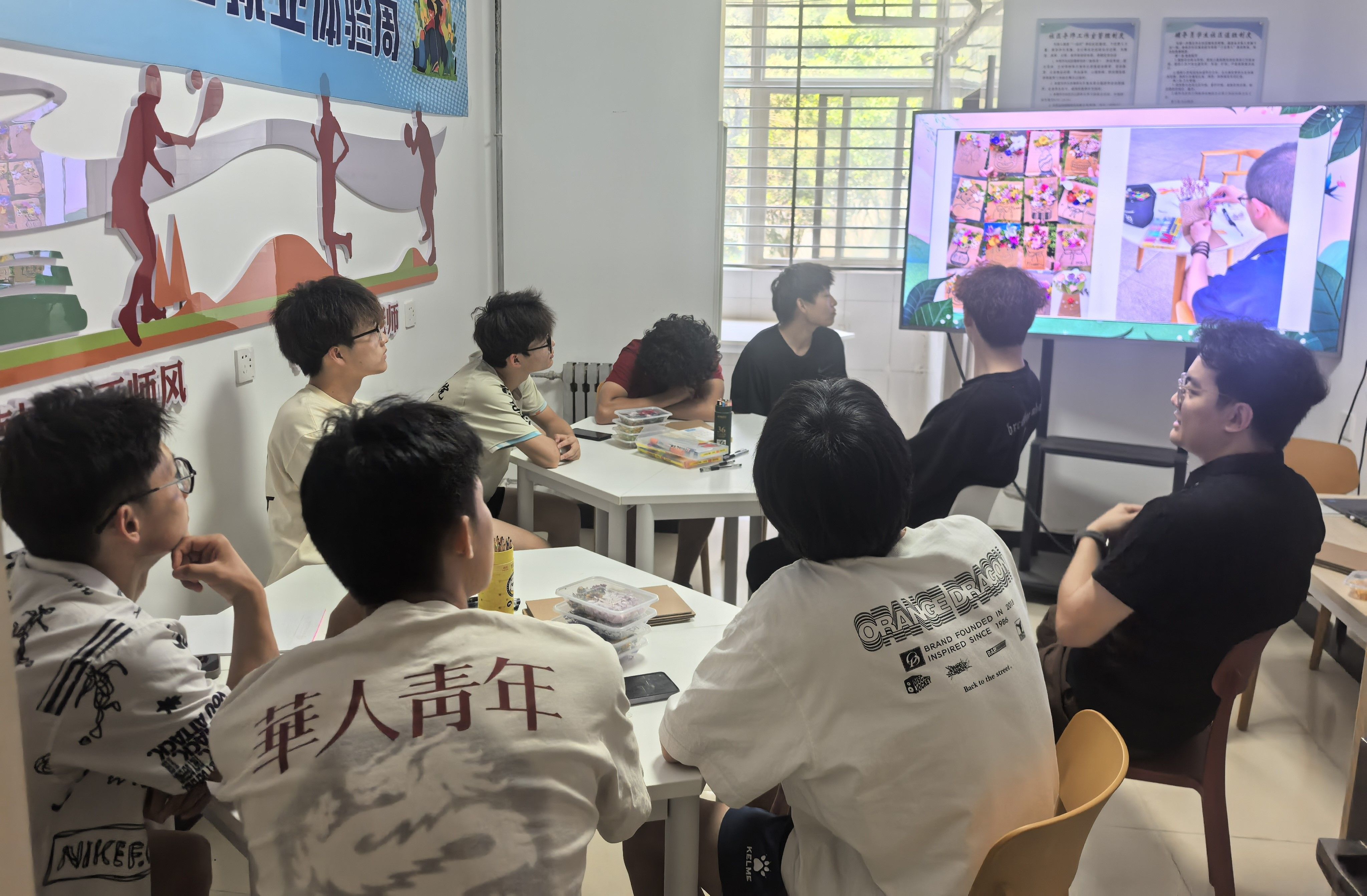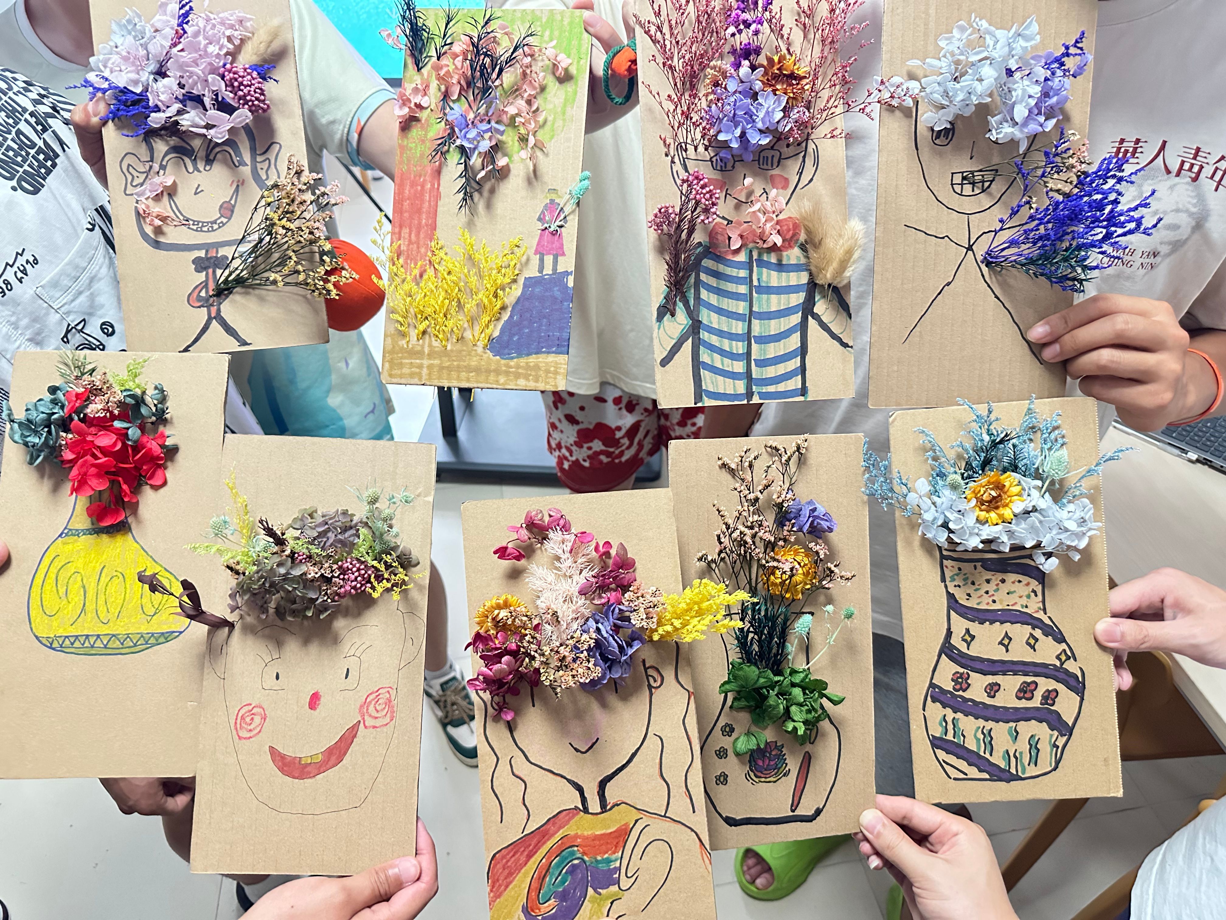 活动伊始,同学们将色彩斑斓的花瓣、花柄错落有致地插入纸板中,从花材
