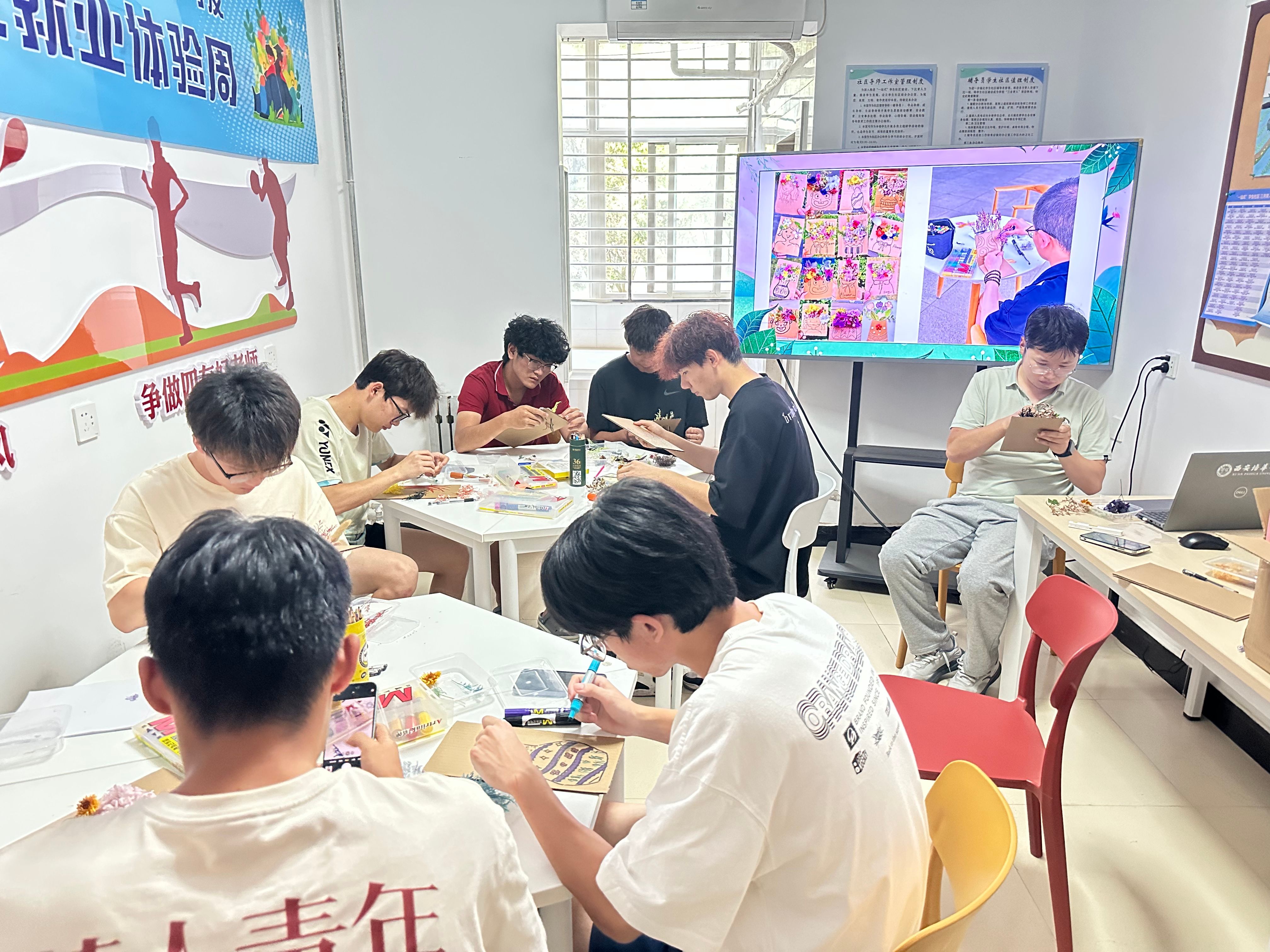 活动伊始,同学们将色彩斑斓的花瓣、花柄错落有致地插入纸板中,从花材的挑选、层次的搭配到纸板的点缀、整体造型的设计,每一步都倾注着专注与巧思,原本单调的纸板和永生花材,在同学们的手中渐渐绽放出独特的浪漫。